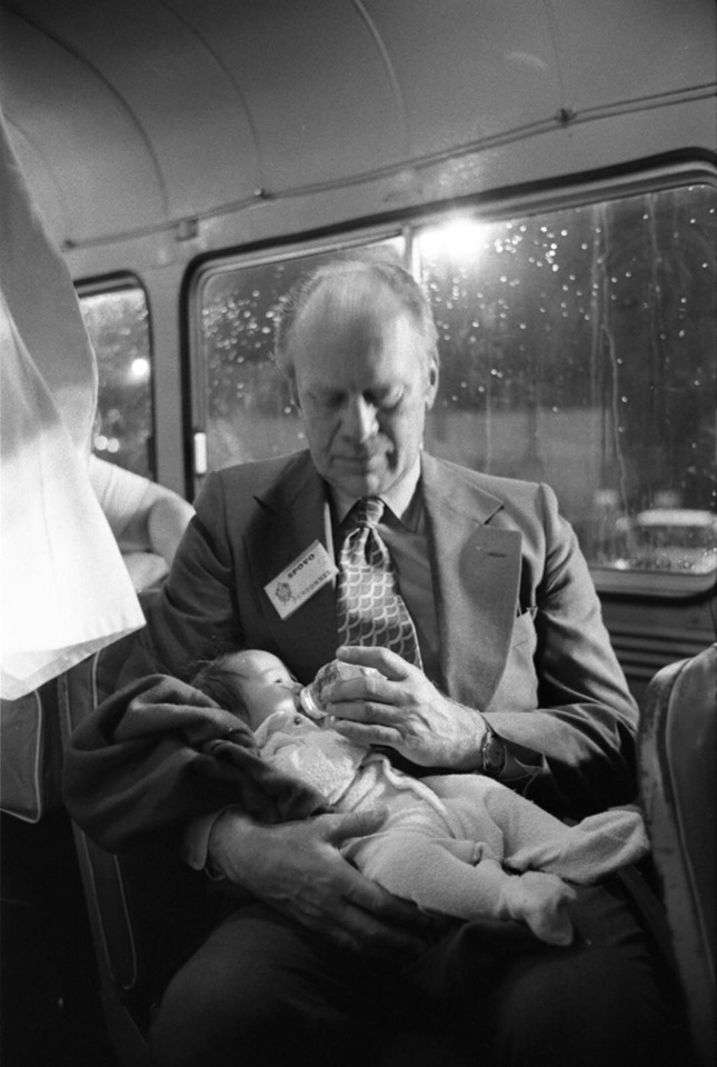 ประธานาธิบดี Gerald Ford ของสหรัฐอเมริกา ป้อนนมทารกชาวเวียดนาม บนรถบัสสำหรับขนผู้ลี้ภัย