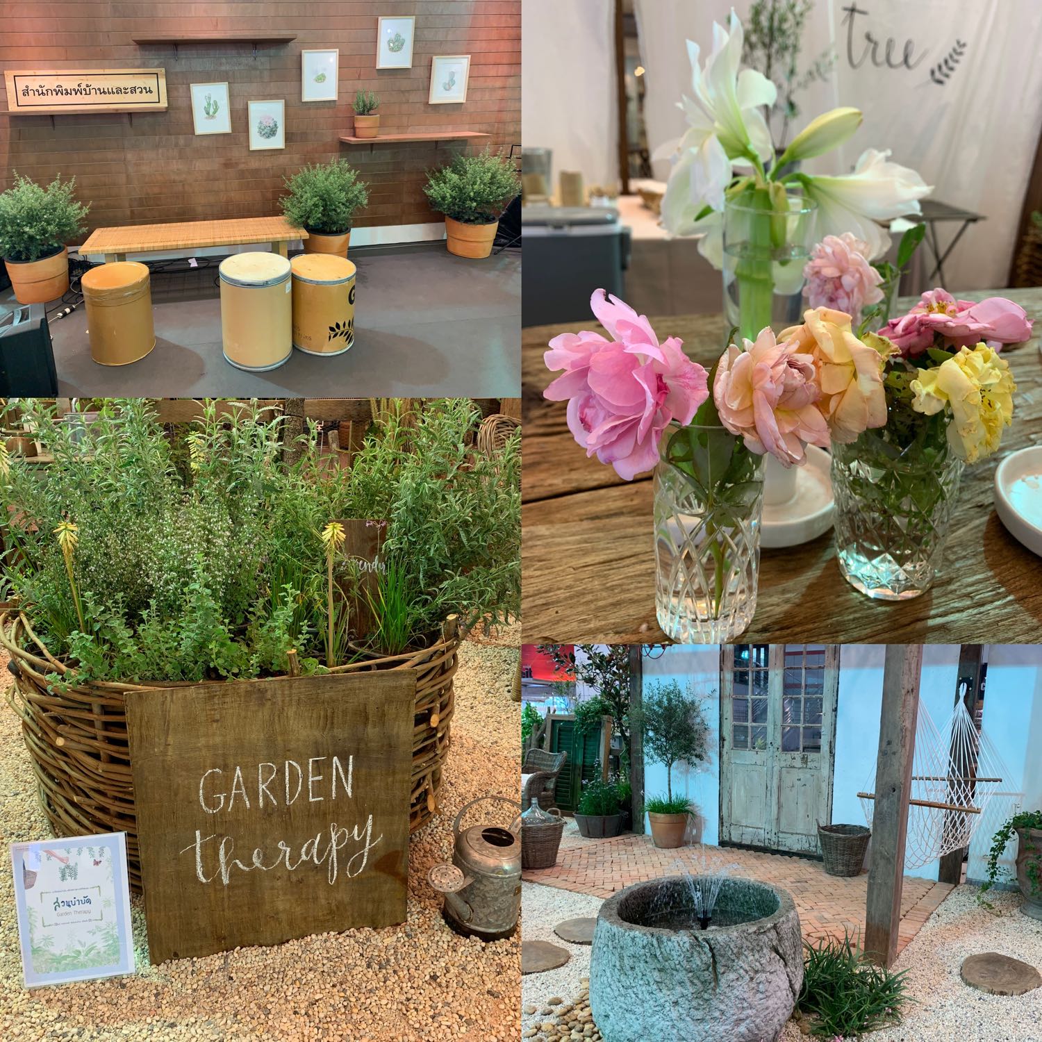 ส่วนแรกที่เจอจัดเป็นสวนค่ะ มีป้ายว่า ‘สวนบำบัด’ มีดอกไม้ต้นไม้จริงประดับอยู่ มีมุมถ่ายรูปสวยเยอะนะคะ