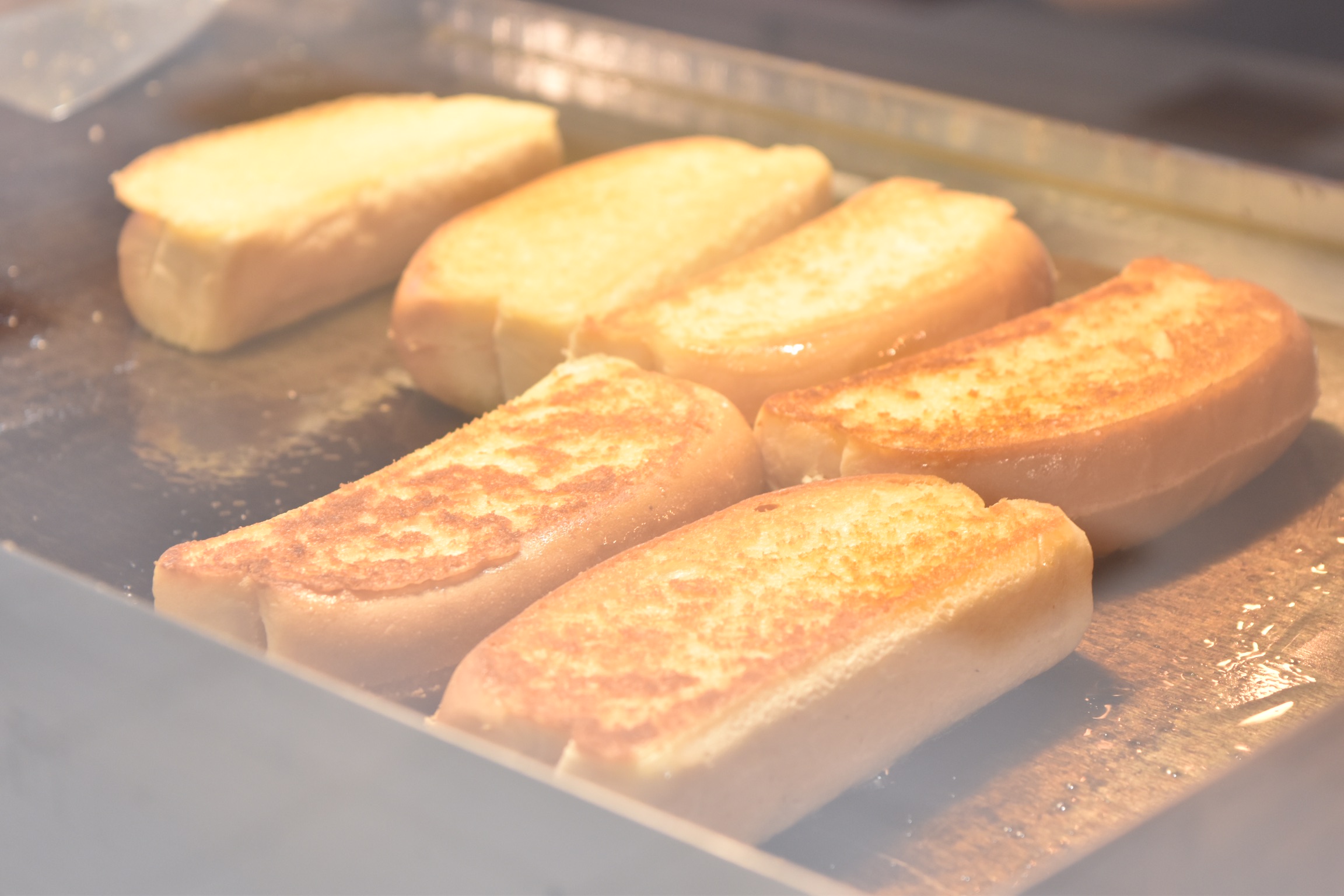 ขนมปังหลังจากทาด้วยเนยแล้ว ก็นำไปSear บนเตา ให้มีความกรอบด้านนอก แต่ด้านในยังคงความหอมนุ่มอยู่