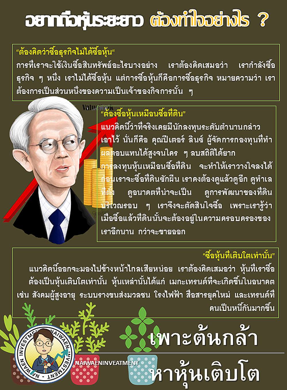 การที่เราจะใช้เงินซื้อสินทรัพย์อะไรบางอย่าง เราต้องคิดเสมอว่า เรากำลังซื้อธุรกิจ ๆ หนึ่ง เราไม่ได้ซื้อหุ้น แต่การซื้อหุ้นก็คือการซื้อธุรกิจ หมายความว่า เราต้องการเป็นส่วนหนึ่งของความเป็นเจ้าของกิจการนั้น ๆ