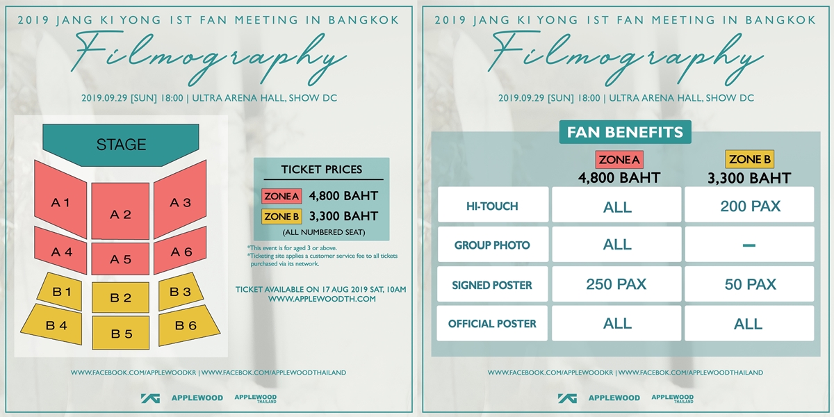 แต่ที่แน่ๆ แฟนๆเตรียมตัวกันให้พร้อม เพราะหนุ่มสุดหล่อคนนี้ ตั้งอกตั้งใจซ้อม เพื่อแฟนมีตติ้งครั้งนี้อย่างมาก ทั้งร้อง ทั้งเต้น จัดเต็มทุกกิจกรรม แถมยังคิดเกมส์เตรียมที่จะมาเล่นกับแฟนคลับในไทยด้วยตัวเอง งานนี้รับรองความฟิน นั่งไม่ติดเก้าอี้แน่นอน การันตีความฟินโดยผู้จัดใจดีอย่าง บริษัท แอ๊ปเปิ้ลวูด (เกาหลี)(APPLEWOOD CREATIVE) และ บริษัท แอ๊ปเปิ้ลวูด (ไทยแลนด์) (APPLEWOOD THAILAND) พร้อมดีเดย์เปิดจำหน่ายบัตรงานแฟนมีตติ้ง “Jang Ki Yong 1st Fan meeting in Bangkok” [Filmography] ทั่วประเทศในวันเสาร์ที่ 17 สิงหาคม 2562 ตั้งแต่เวลา 10:00 น. เป็นต้นไป ทาง www.applewoodth.com บัตรราคา 4,800 / 3,300 บาท ติดตาม และสอบถามรายละเอียดเพิ่มเติมได้ที่ Official Facebook Pages: www.facebook.com/applewoodkr และ www.facebook.com/applewoodthailand