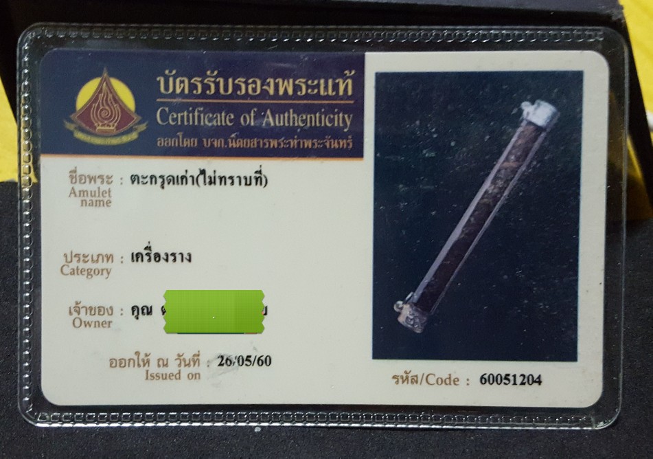 ตะกรุดแกนทองแดง ยาวประมาณ4.5นิ้ว มีกลิ่นเหมือนผสมผงว่านหรืผงยาด้วยค่ะ แต่กลิ่นไม่ได้แรงมาก หาที่มานานแต่ไม่รู้สักทีเพราะมองเหมือนๆกันหลายเกจิ ใครพอทราบว่าที่ไหนช่วยบอกหน่อยระคะ ขอบคุณมากๆค่ะ..แล้วเราเคยไปออกใบรับรองเขียนไปว่าไม่รู้ที่ เรานึกว่าเค้าจะใส่ที่ให้เรา แต่ได้ใบมาก็ตามที่เราเขียนไปค่ะ คือแท้ ไม่รู้ที่