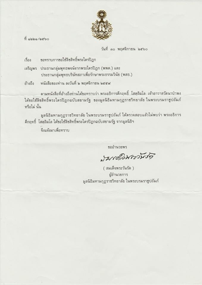 หนังสือ สอบถามเกี่ยวกับการนำพระไตรปิฎกบาลีสยามรัฐ มาตัดเนื้อหาออกหลายเล่ม