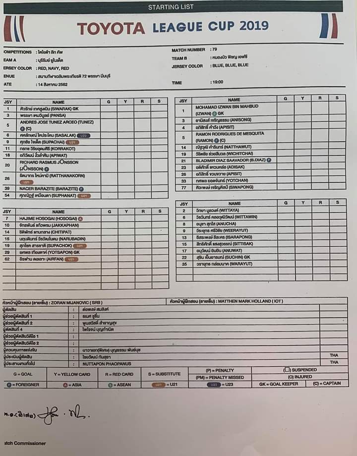 ใบรายชื่อ 11 ตัวจริงคู่บุรีรัมย์หนองบัวพิชญออกมาแล้ว