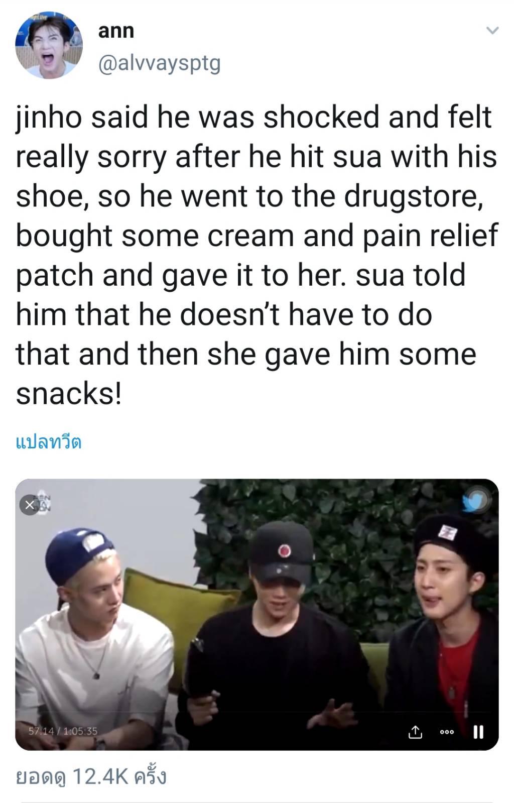 ซึ่งหลังวันงาน จินโฮได้ถูกถามถึงเรื่องนี้กลางไลฟ์ และเล่าว่า เขารู้สึกเสียใจมาก เลยไปที่ร้านขายยา แล้วซื้อยาทามาให้ซูอา ซูอาก็ตอบกลับมาว่า ไม่ต้องก็ได้ และให้ขนมมา