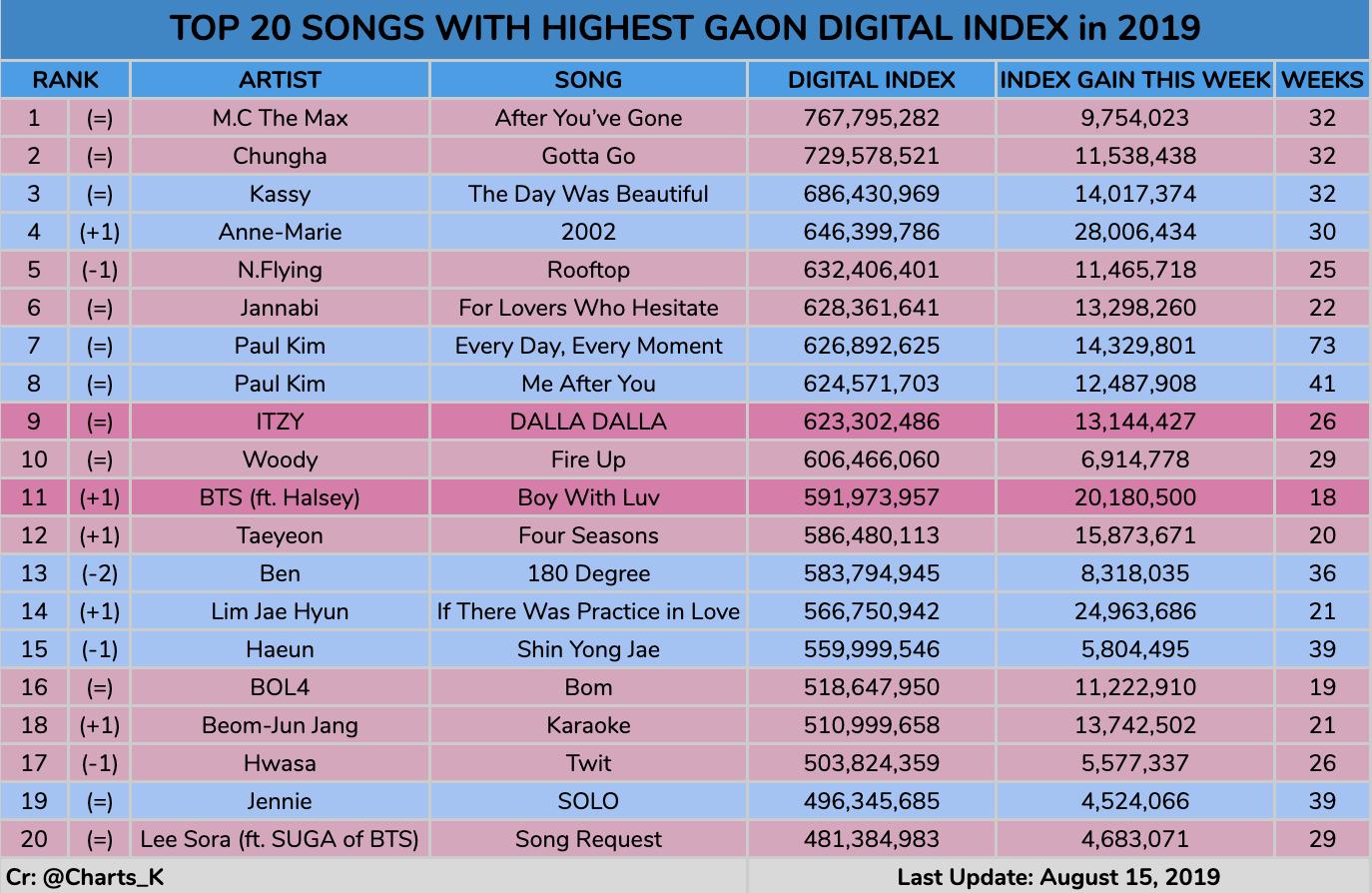 TOP 20 Songs with Highest Gaon Digital Index in 2019