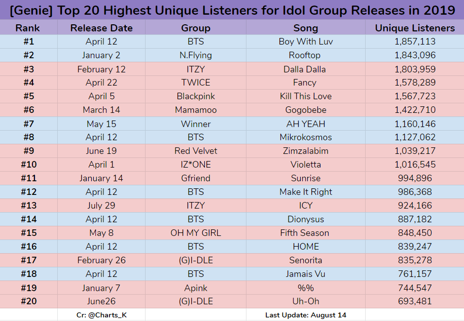 [Genie] Top 20 Highest Unique Listeners for Idol Group Releases in 2019