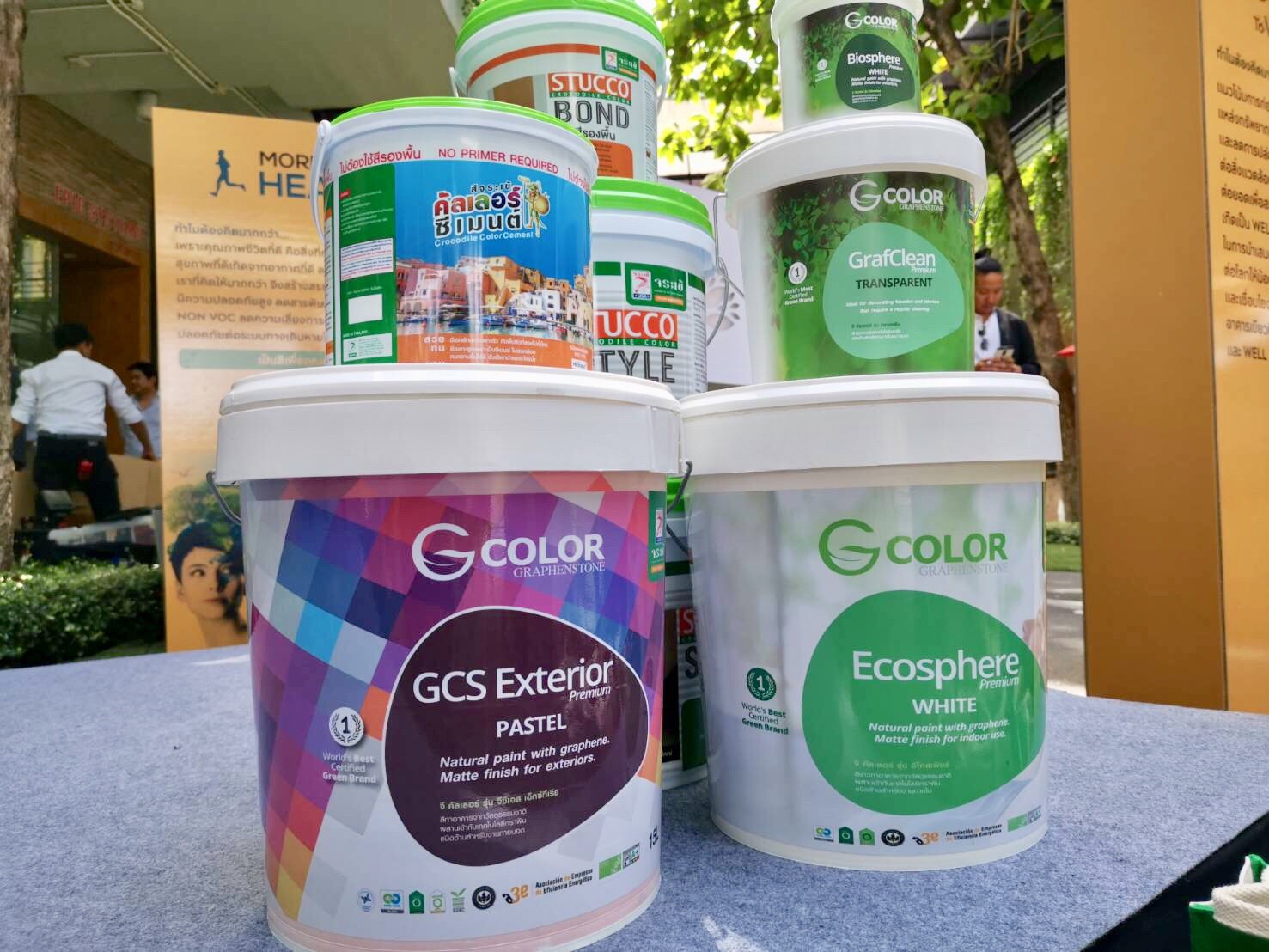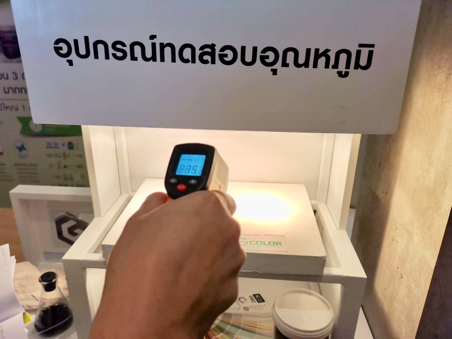 ผลิตภัณฑ์สีที่จัดแสดงมี 2 ประเภท ได้แก่ สีทาอาคารที่หายใจได้ ผลิตจาก Lime Stone,