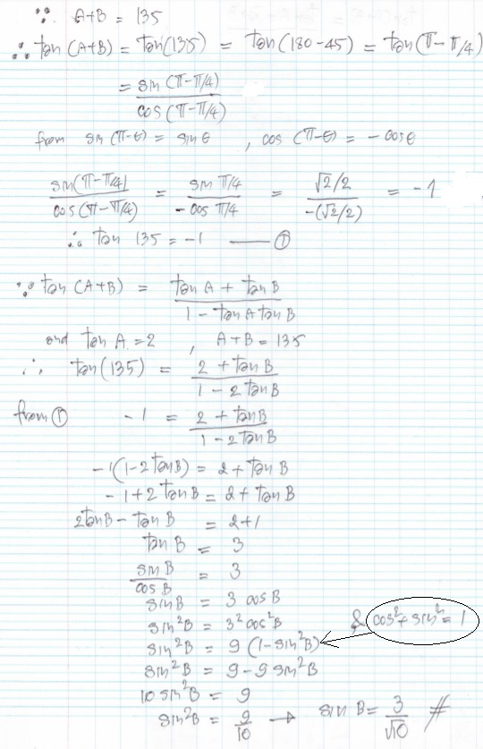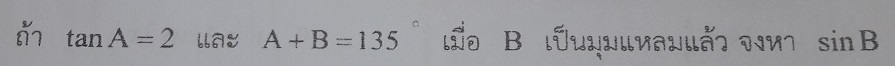 วิธีที่สองผิดครับ มุมในสามเหลี่ยม = (A+B)+90 = 135+90 = 225 > 180 ซึ่งเป็นไปไม่ได้ครับ (มุม A,B ไม่เกี่ยวกันเลยครับ (ยกเว้นที่ต้องรวมกันได้ 135) ไม่สามารถวาดในรูปสามเหลี่ยมรูปเดียวกันได้)