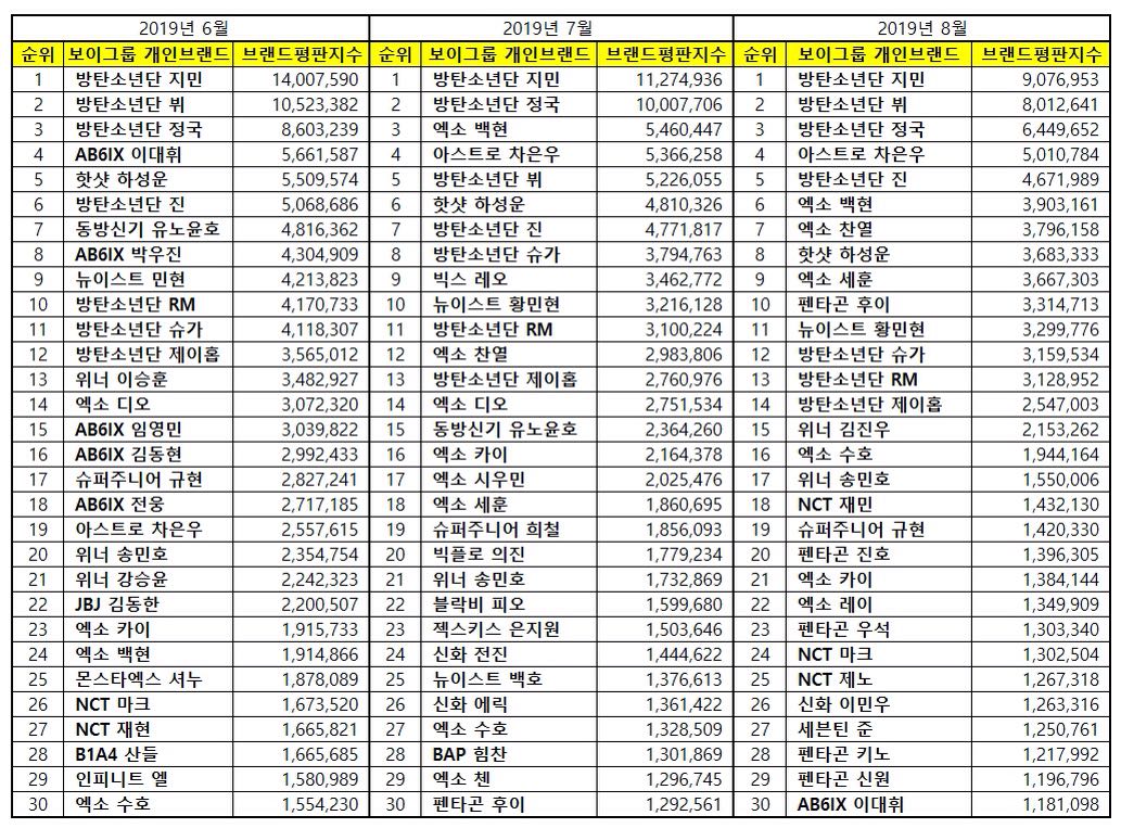 อันดับชื่อเสียงสมาชิก Boy Group ประจำเดือน สิงหาคม 2019