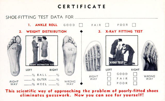 ในช่วงต้นที่มีการประดิษฐ์เครื่องกำเนิดรังสีเอ๊กซ์ออกมา ยังไม่มีใครคิดว่ารังสีชนิดนี้จะมีอันตราย ทั้งที่ได้ทำให้เกิดการบาดเจ็บขึ้นกับนักวิทยาศาสตร์และช่างเทคนิค อุปกรณ์มหัสจรรย์นี้ถูกนำไปใช้ในคลินิกของแพทย์ ห้องปฏิบัติการทางทหาร รวมทั้งในร้านรองเท้า ในช่วงทศวรรษปี 1930-1960 เด็กๆ ได้รับการสนับสนุนให้วัดขนาดรองเท้าด้วยเครื่องมือวิทยาศาสตร์ โดยการวางเท้าที่อุปกรณ์เรืองรังสีเอ๊กซ์ (x-ray fluoroscope) ที่มีในร้านขายรองเท้า ทั้งพนักงานขายรองเท้าและผู้ซื้อจะสามารถมองเห็นกระดูกของเท้า (รวมทั้งได้รับรังสีเอ๊กซ์ที่กระจายออกมาด้วย) ในปี 1950 จึงมีการยอมรับกันว่าอุปกรณ์ชิ้นนี้เป็นอันตราย แต่การห้ามใช้ก็ถูกกำหนดไปทีละรัฐ จนถึงปี 1970 หลายรัฐก็ยังมีเครื่องนี้ใช้อยู่ จนกระทั่งหมดลงเมื่อถูกสั่งห้ามการผลิต แต่ก็ยังมีการใช้ในยุโรปอีกหลายปีหลังจากนั้น