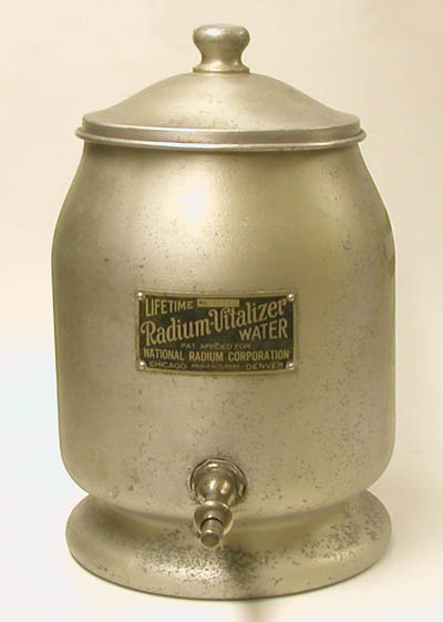 หลังจากนั้นมาประมาณตั้งแต่คริสต์ทศวรรษ 1920 น้ำที่มีสารกัมมันตรังสีก็เป็นที่นิยมจนมีผลิตภัณฑ์ที่เรียกว่า น้ำเรเดียม ออกจำหน่าย โดยทำเป็นโถน้ำใบเขื่อง ด้านในโถน้ำอาจฉาบด้วยสารประกอบยูเรเนียม หรือเป็นโถน้ำเปล่า ๆ แต่มีก้อนสารประกอบขนาดประมาณ 4นิ้ว ×2นิ้วที่มีเรเดียมหรือยูเรเนียมผสม นำมาวางไว้ข้างในโถน้ำ เมื่อเติมน้ำลงไปก็จะได้น้ำที่มีแก๊สเรดอนละลายปนออกมา