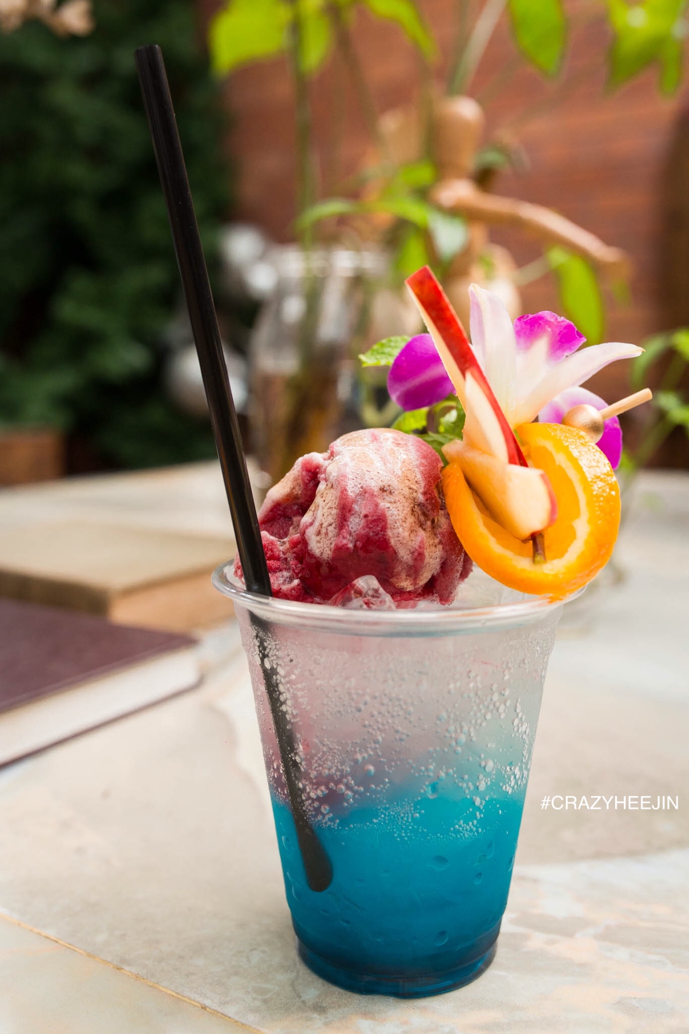 น้ำบลูพาราไดส์ ทอปปิ้งด้วย ไอศครีมกระเจี๊ยบเชอร์เบท คือดีย์มาก ~