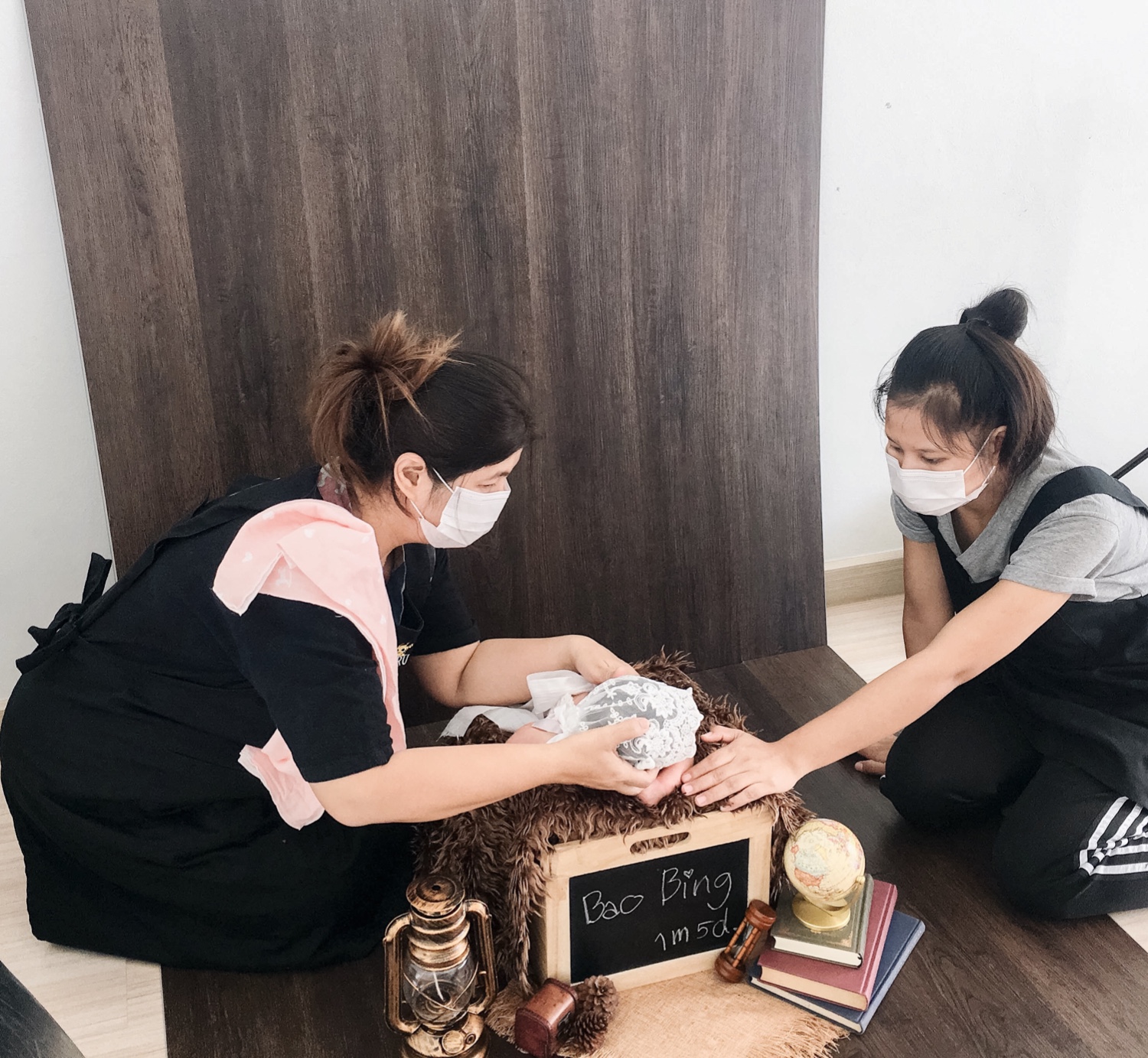 ก่อนที่แนนนี่จะมาอุ้มลูกแม่ไป เขามีการทำความสะอาดมือก่อนด้วยเจลฆ่าเชื้อด้วยนะคะไม่ใช่อยู่ดีๆ ก็มาจับตัวเบบี๋เลย คือเขารักษาความสะอาดจริงๆ ค่ะ นอกจากจะล้างมือด้วยเจลแล้วยังใส่หน้ากากอนามัยด้วย ระหว่างที่ทางแนนนี่กำลังแต่งสวยให้กับลูกสาวอยู่นั้น บรรยากาศก็ไม่เงียบเหงาเพราะช่างภาพก็มีความเป็นมืออาชีพมาก ไม่ใช่แค่เซ็ตอุปกรณ์เสร็จแล้วจะนิ่งเฉย เหมือนเขารู้ว่าต้องมีอะไรมาช่วยให้เด็กที่มาถ่ายเพลิน นี่เลยค่าเพลย์ลิสต์สำหรับเบบี๋เรียกได้ว่ามีทุกแนวเพลง