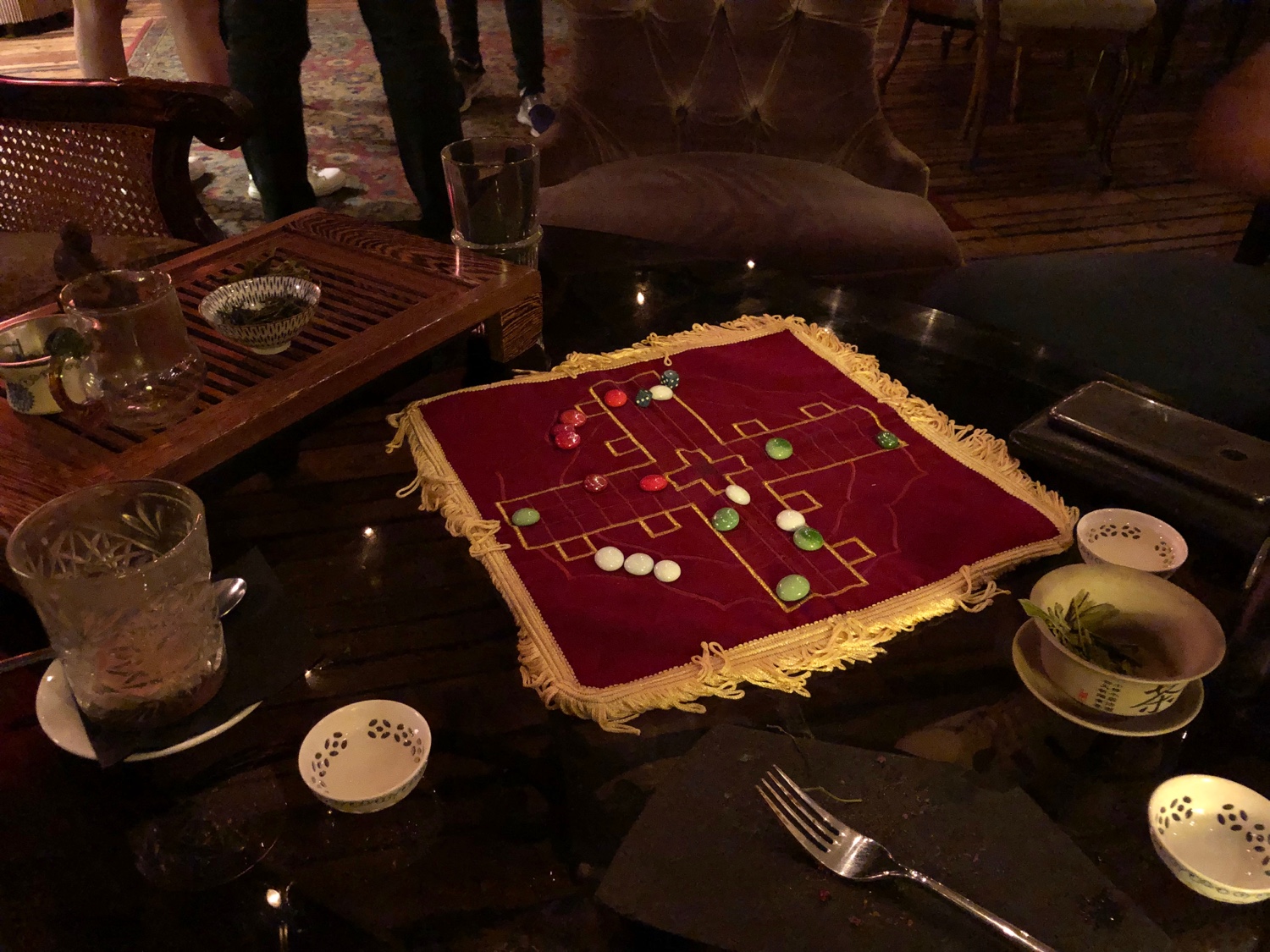 แต่ร้านก็สวยงามมม ใหญ่โตโอ่อ่า คุ้มค่าที่ทางเข้ายากเย็นขนาดนี้ ตอนแรกคิดว่าร้านจะเล็กๆเพราะเป็นอพาร์ทเมนท์ห้องเดียว อาหารต่างๆก็ราคาเเพงนิดนึง นั่งสักพักพนักงานสาวสวยก็เข้ามาถามว่าอยากเล่นเกมส์ไหม แล้วเค้าก็เอาเกมส์มาให้เล่นพร้อมอธิบายว่าเล่นยังไง เราก็เล่นกันเพลินๆสองชั่วโมง เค้าว่าเป็นเกมส์ของอินเดีย ชื่อ Cho pra ฟังออกประมาณนี้ ไม่เเน่ใจว่าถูกไหม