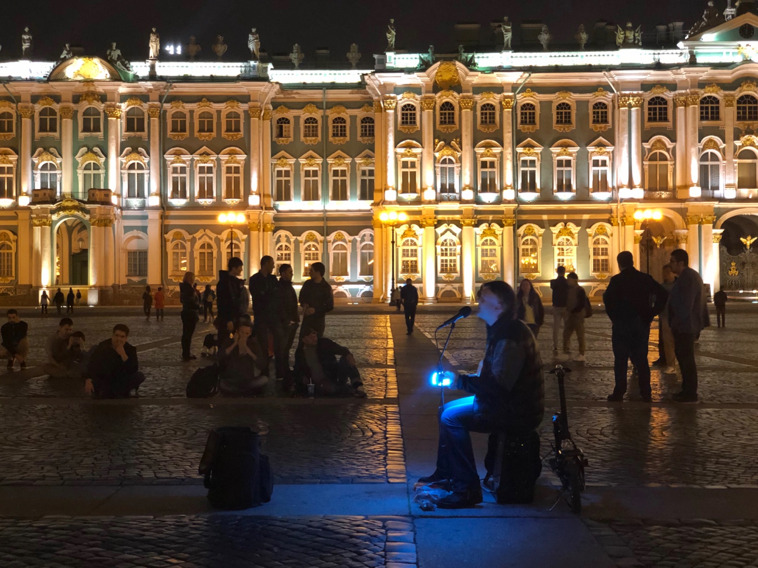 เราเดินเล่นกันแถวๆ Winter Palace กันสักพัก เเถวๆหน้า Winter Palace ตอนกลางคืนต่างกับกลางวันเลยค่ะ อารมณ์แบบโรเเมนติกมากก เเสงไฟนวลๆ แล้วข้างหน้าก็จะมีคนร้องเพลง มีคนมาล้อมวงฟังมากมาย ทั้งเด็กทั้งผู้ใหญ่ บรรยากาศชิวมากกก ซึ่งวันนี้เพลงที่เค้าร้องเป็นเพลงที่เป็นที่นิยมตั้งเเต่สมัยโซเวียต โดยเนื้อเพลงกล่าวถึงชีวิตที่อิสระ เราฟังไม่รู้เรื่องด้วยดนตรี ด้วยเสียงร้องยังทำให้เราอินไปด้วยเลยค่ะ