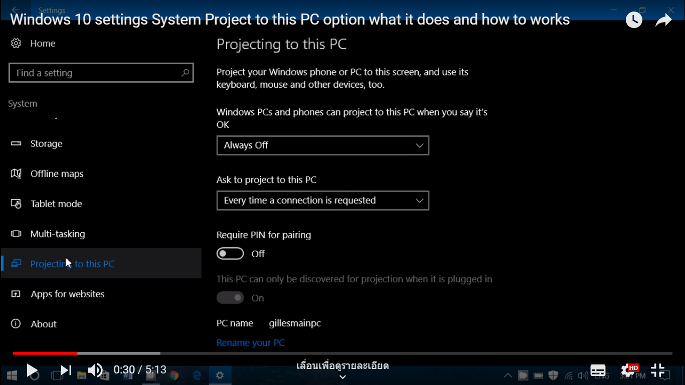 ภาพล่างนี้เป็นตัวอย่างที่มี Projecting to this pc ปกติ (แคปภาพจากยูทูป)