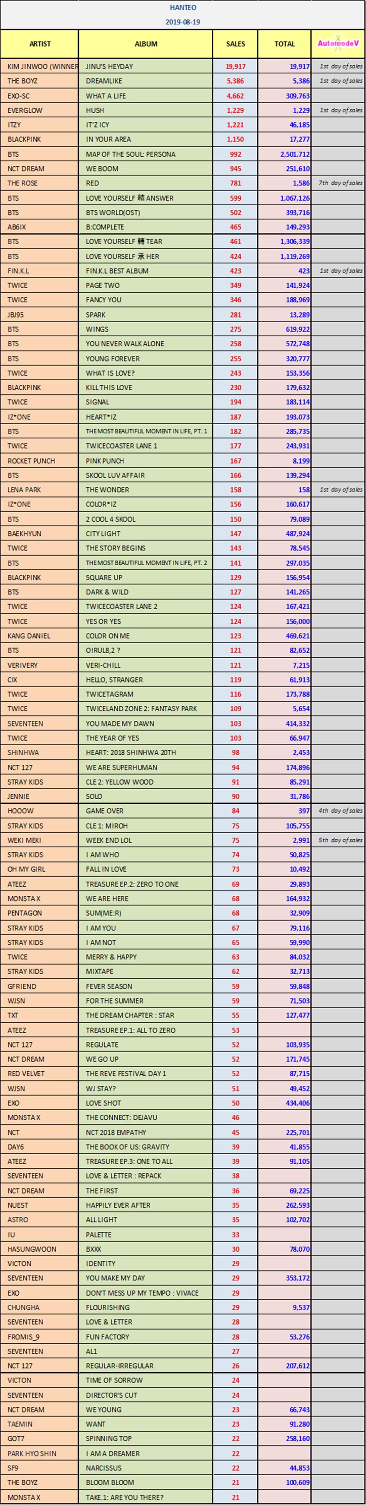 ยอดซื้ออัลบั้มจากชาร์ต HANTEO 19 สิงหาคม 2562