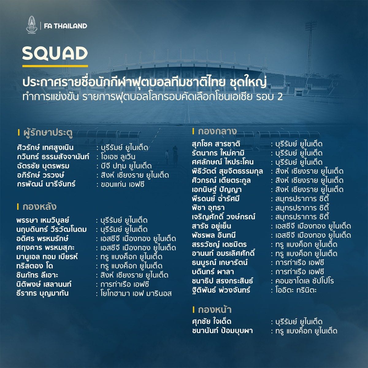 สมาคมฯ ประกาศรายชื่อ 33 แข้ง ช้างศึก ชุดทำศึกฟุตบอลโลก รอบคัดเลือก พบกับ เวียดนาม