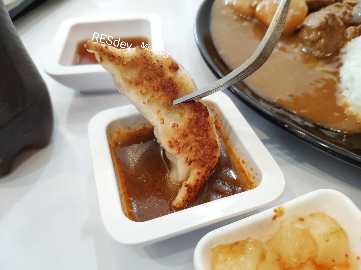 สิ่งของที่มาถึงโต๊ะแรก ๆ ก็จะเป็นข้าวราดแกงกะหรี่หมูนั่นเอง มาเร็วมาก และก็ต่อด้วยเกี๊ยวซ่าที่ตามมาติด ๆ กับน้ำจิ้ม 2ชนิด แต่ที่เป็นข้าวราดแกงกะหรี่หมูสันในทอดก็จะช้ากว่าหน่อย (เพราะมันต้องทอดแหละมั้ง) ได้เวลากินกันแล้ววววว