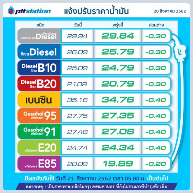 แจ้งข่าวดีคนใช้รถทุกคน พรุ่งนี้น้ำมันทุกชนิดทั้งกลุ่มดีเซลและกลุ่มเบนซิน ปรับลดราคาลง* โดยน้ำมันพีทีที อัลตร้าฟอร์ซ ดีเซล, ดีเซลพรีเมียม, พีทีที อัลตร้าฟอร์ซ ดีเซล B10 และ ดีเซล B20 ปรับลดลง 30 สตางค์/ลิตร ส่วนน้ำมันกลุ่มเบนซินและแก๊สโซฮอล์ทุกชนิด ปรับลดลง 40 สตางค์/ลิตร เว้น E85 ปรับลดลง 20 สตางค์/ลิตร มีผลวันพรุ่งนี้ (21 ส.ค. 2562) ตั้งแต่เวลาตี 5 เป็นต้นไป