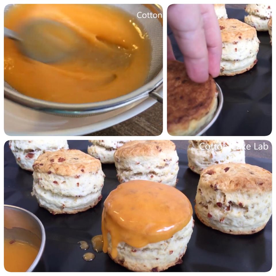 5 บี้ส่วนผสมไข่แดงเค็มให้เข้ากัน แล้วจิ้มหน้าสโคนลงให้สีสวย ทานได้ละค่ะ หรือจะรอแห้งได้ แต่สีจะซีดลง