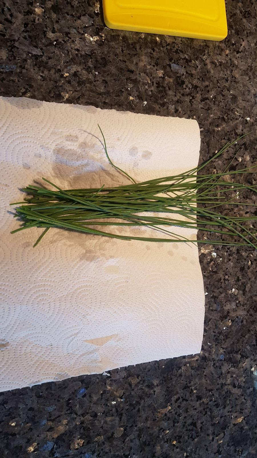 ได้ข้าวริซอตโตคุณภาพดีมา เก็บหัวหอมและต้น chives ในกระถางมาล้างสับ