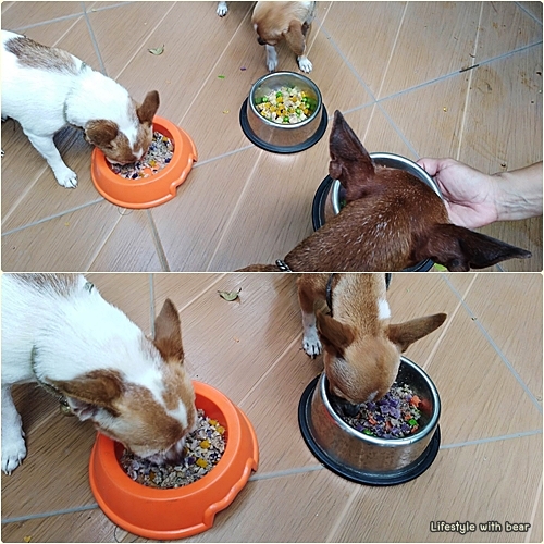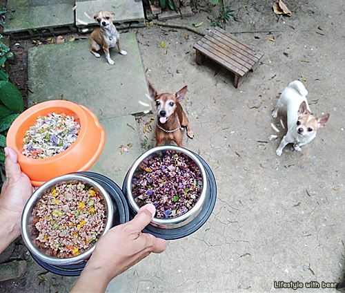 ที่บ้านเราก็มีน้องๆ อยู่ด้วยกัน 3 ตัว เป็นน้องตัวเล็กๆ พันธุ์ชิวาว่ากับมิเนเจอร์ แต่ กินเก่งมากกกก แล้วก็ช่างเลือกด้วยล่ะอันไหนไม่ถูกใจก็เขี่ยออก ไม่กิน ส่ายหน้าหนีเลยจ้า …. ส่วนใหญ่เราจะให้เค้ากินเป็นอาหารเม็ด กับขนมของสุนัข แต่ก็มีบางช่วงรู้สึกว่าน้องแอบเบื่อเหมือนกันนะ