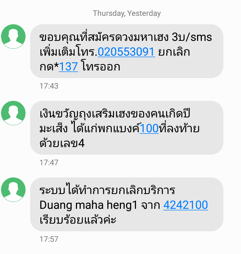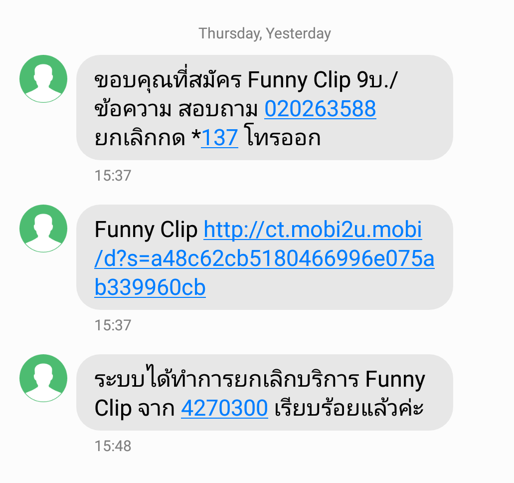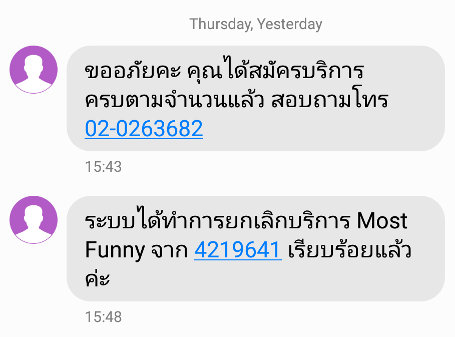 วันนี้มันเกิดขึ้นอีกแล้วครับ สมัครได้ไงก็ไม่รู้ ดูดเงินจากเบอร์ผมไปอีกแล้ว กด*137ยกเลิก มันก็สมัครเองอีก โทรหาคอลเซ็นเตอร์ก็ไม่มีประโยชน์ เพราะระบบไม่ยอมให้คุยกับ "มนุษย์" ตัวเป็นๆ ถ้าผมต้องมาคอยตั้งกระทู้แบบนี้ทุกครั้งที่เกิดปัญหา เราคงต้องลาจากกันครับทรูมูฟเอช