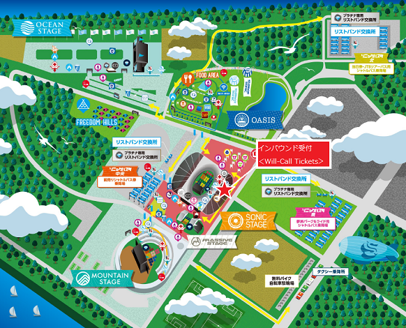 อย่างที่ให้ข้อมูลไว้ด้านบนว่า ผมจองบัตรเข้างานมากับ Ticketmelon ก่อนวันงานได้มีอีเมล์แจ้งมาว่าให้ไปแลกริสแบนด์ที่บูธ Will – Call Tickets ซึ่งอยู่บริเวณหน้า Sonic Stage (เป็นสนามบาสของทีม Osaka Evessa) โดยต้องนำเอาพาสปอร์ตของผู้ที่จองไปด้วย