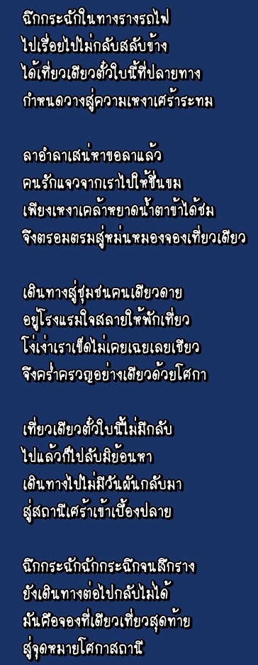 ในราตรี ที่เปราะบาง ช่างวังเวง มีแค่เพียง เสียงเพลง บรรเลงกล่อม คิดถึงคน ที่ทะเลาะ เพราะไม่ยอม จนวันนี้ ตรมตรอม ยอมแพ้เธอ ใจดวงหม่น สนทนา กับความเหงา เพื่อนคนเก