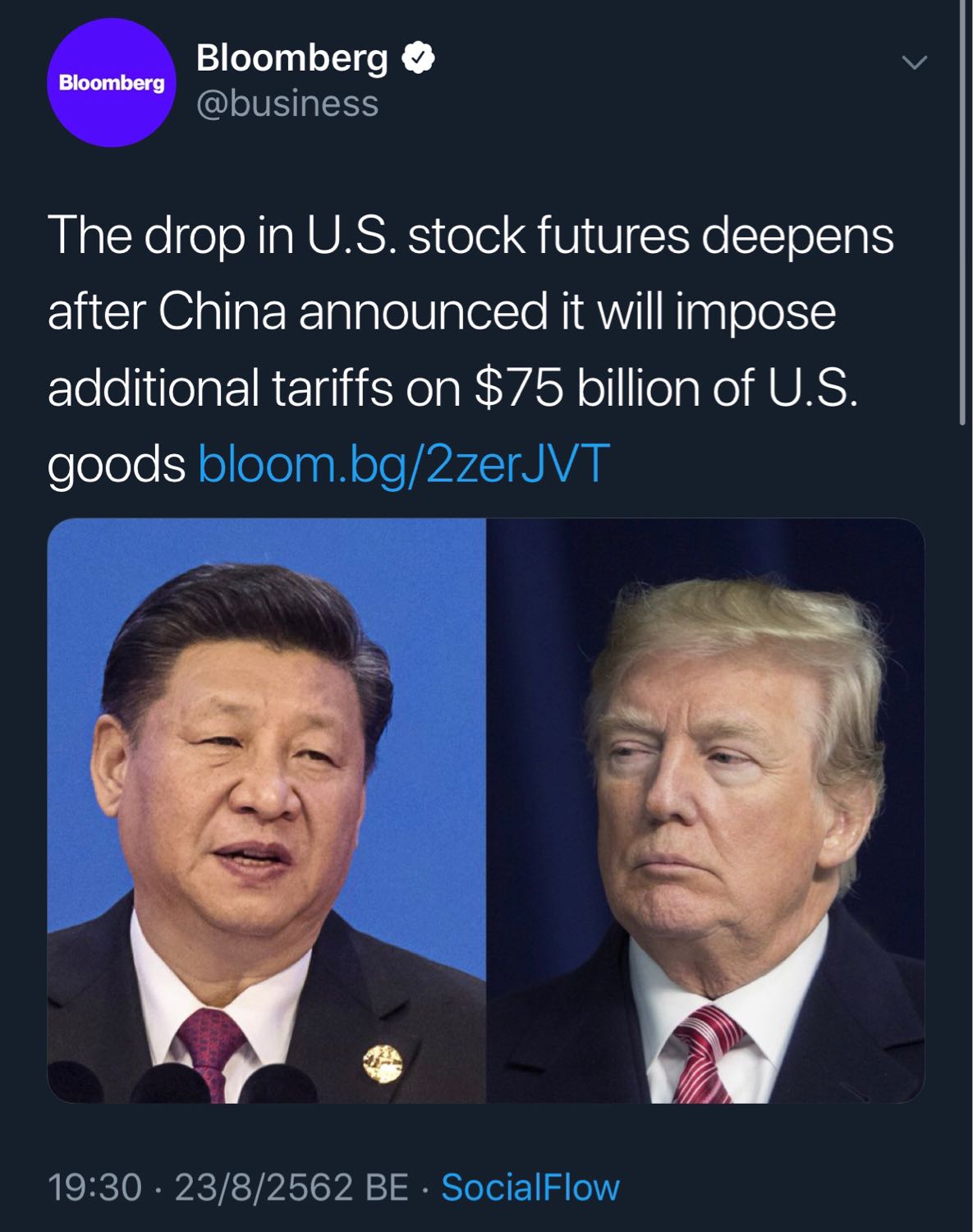 จีนเพิ่งประกาศมาตรการไม้แข็ง เมื่อสักครู่นี้ครับ “เราเตรียมขึ้นภาษีนำเข้าสินค้าจากสหรัฐ มูลค่า 6 หมื่นล้านเหรียญ หรือ 2 ล้านล้านบาท!!” . ด่วน!! Dow Jones Futures ถูกเทหนัก 453 จุด หลังจีนใ
