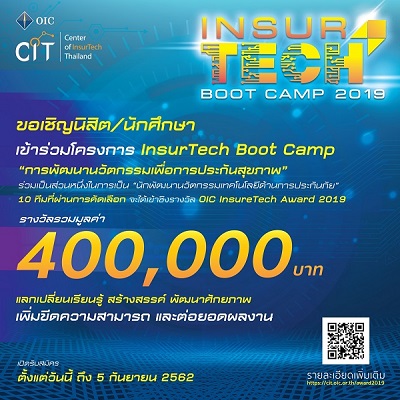 สำนักงานคณะกรรมการกำกับและส่งเสริมการประกอบธุรกิจประกันภัย (สำนักงาน คปภ.) โดยศูนย์ Center of InsurTech, Thailand (CIT) ขอเชิญชวนนิสิต/นักศึกษา เข้าร่วมโครงการ InsurTech Boot Camp 2019 สร้างสรรค์นวัตกรรมเทคโนโลยีด้านการประกันภัย ภายใต้โจทย์ “การพัฒนานวัตกรรมเพื่อการประกันสุขภาพ”ร่วมจุดประกายความคิด สร้างสรรค์นวัตกรรมใหม่ เพื่อพลิกโฉมอุตสาหกรรมประกันภัยไปอีกระดับ ชิงเงินรางวัลรวมกว่า