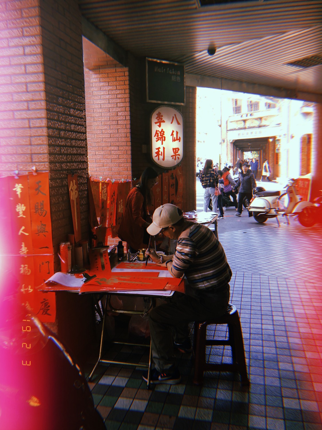 ซึ่งพอดีช่วงนั้นเป็นวันหยุดตรุษจีนของที่ไต้หวัน ตามทางเดินก็จะขายป้ายมงคลสีแดงไว้ใช้สำหรับติดตามประตูบ้าน