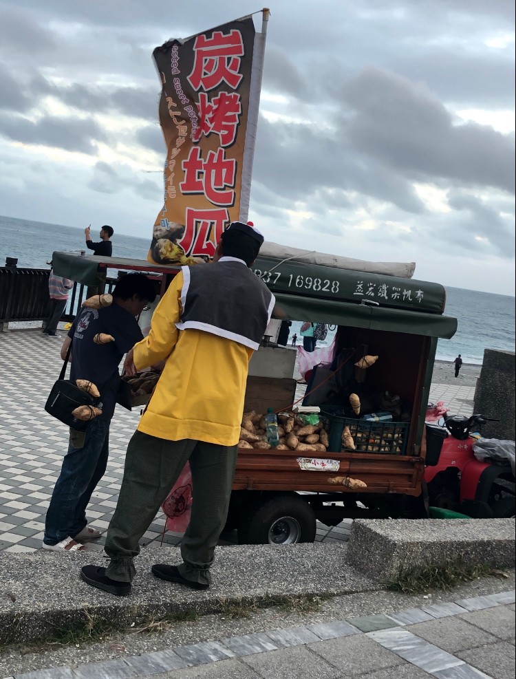 ติดกับหาดก็จะมีสวนสาธารณะเล็กๆ มีพ่อค้าแม่ค้านำของมาขายกัน อย่างเช่นร้านนี้ก็ขายมันเผา แต่งตัวคอสเพลย์ซะด้วย