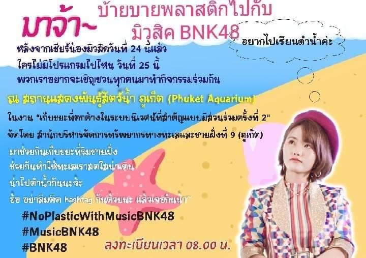ทีมแฟนคลับน้องมิวสิค จึงจัดโปรเจค #บ๊ายบายพลาสติกไปกับมิวสิคBNK48 ร่วมทำกิจกรรมเก็บขยะ ณ สถานแสดงพันธุ์สัตว์น้ำ ภูเก็ต ที่จัดโดย สำนักงานบริหารจัดการทรัพยากรทางทะเลและชายฝั่งที่9 (ภูเก็ต) กิจกรรมจัดภายใต้ชื่องาน เก็บขยะที่ตกค้างในระบบนิเวศที่สำคัญแบบมีส่วนรวมครั้งที่ 2