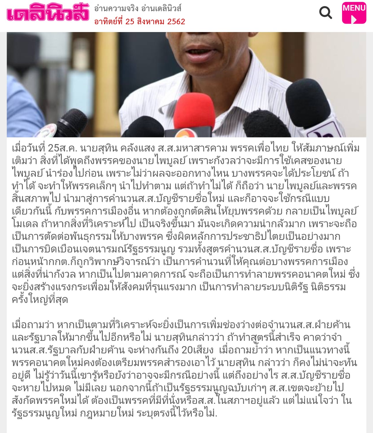 เมื่อวันที่ 25ส.ค. นายสุทิน คลังแสง ส.ส.มหาสารคาม พรรคเพื่อไทย ให้สัมภาษณ์เพิ่มเติมว่า สิ่งที่ได้พูดถึงพรรคของนายไพบูลย์ เพราะกังวลว่าจะมีการใช้เคสของนายไพบูลย์ นำร่องไปก่อน เพราะไม่ว่าผลจะออกทางไหน บางพรรคจะได้ประโยชน์ ถ้าทำได้ จะทำให้พรรคเล็กๆ นำไปทำตาม แต่ถ้าทำไม่ได้ ก็ถือว่า นายไพบูลย์และพรรคสิ้นสภาพไป นำมาสู่การคำนวนส.ส.บัญชีรายชื่อใหม่ และก็อาจจะใช้กรณีแบบเดียวกันนี้ กับพรรคการเมืองอื่น หากต้องถูกตัดสินให้ยุบพรรคด้วย กลายเป็นไพบูลย์โมเดล ถ้าหากสิ่งที่วิเคราะห์ไป เป็นจริงขึ้นมา มันจะเกิดความน่ากลัวมาก เพราะจะถือเป็นการตัดต่อพันธุกรรมให้บางพรรค ซึ่งผิดหลักการประชาธิปไตยเป็นอย่างมาก เป็นการบิดเบือนเจตนารมณ์รัฐธรรมนูญ รวมทั้งสูตรคำนวนส.ส.บัญชีรายชื่อ เพราะก่อนหน้ากกต.ก็ถูกวิพากษ์วิจารณ์ว่า เป็นการคำนวน ที่ให้คุณต่อบางพรรคการเมือง แต่สิ่งที่น่ากังวล หากเป็นไปตามคาดการณ์ จะถือเป็นการทำลายพรรคอนาคตใหม่ ซึ่งจะยิ่งสร้างแรงกระเพื่อมให้สังคมที่รุนแรงมาก เป็นการทำลายระบบนิติรัฐ นิติธรรมครั้งใหญ่ที่สุด