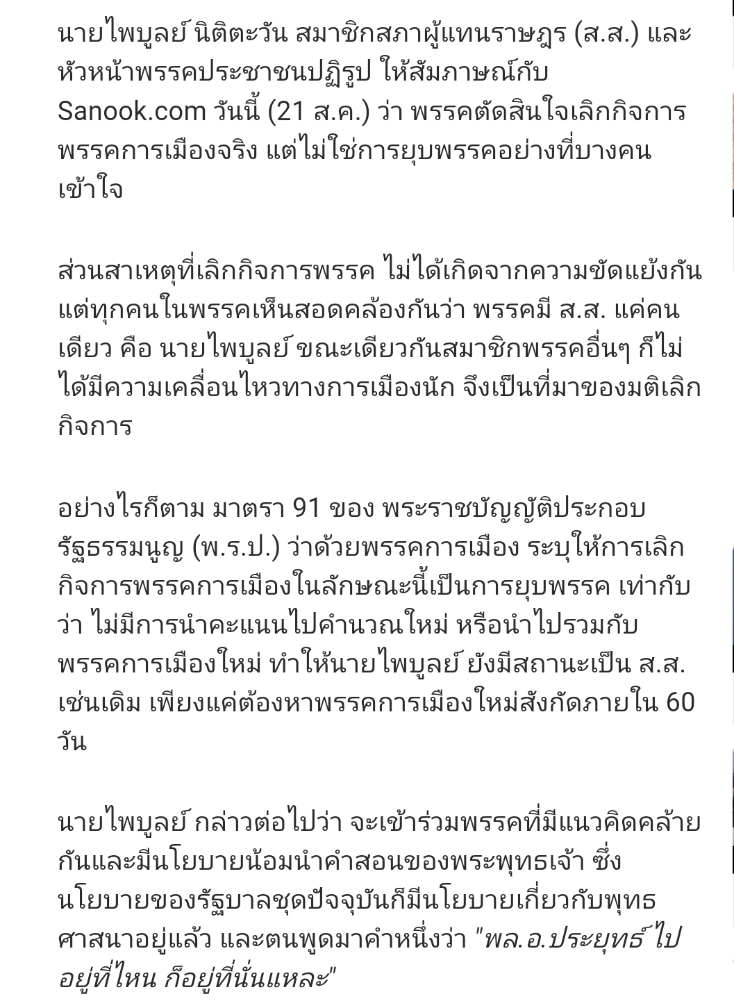 "ไพบูลย์" เชื่อยุบพรรคได้ พร้อมสมัครเข้าพปชร.ทันที หลังกกต.ประกาศยุบพรรคในราชกิจจานุเบกษา - รับไม่สามารถโอนคะแนนไปพรรคอื่นได้ ยินดีพ้นตำแหน่งหากคะแนนไม่อยู่ในเกณฑ์ที่จะได้ ส.ส.