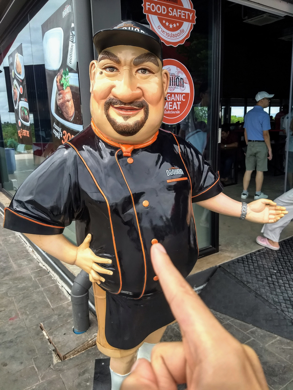 คุณเสกยืนทักทายอยู่หน้าร้าน ถึงจะไม่เจอตัวจริงแบบเป็นๆ แต่ก็เจอตัวจริงแบบปลอมๆ แต่ไหงตัวปลอมถึงดูหล่อกว่าตัวจริงเยอะ (แซวเล่นนะครับ 55555) เลยทักทายสักหน่อยก่อนเข้าร้าน ที่ชี้นี่ไม่ได้หาเรื่องนะครับ มือหนึ่งถือมือถืออยู่ เลยใช้อีกมือหนึ่งชื้เอา 55555