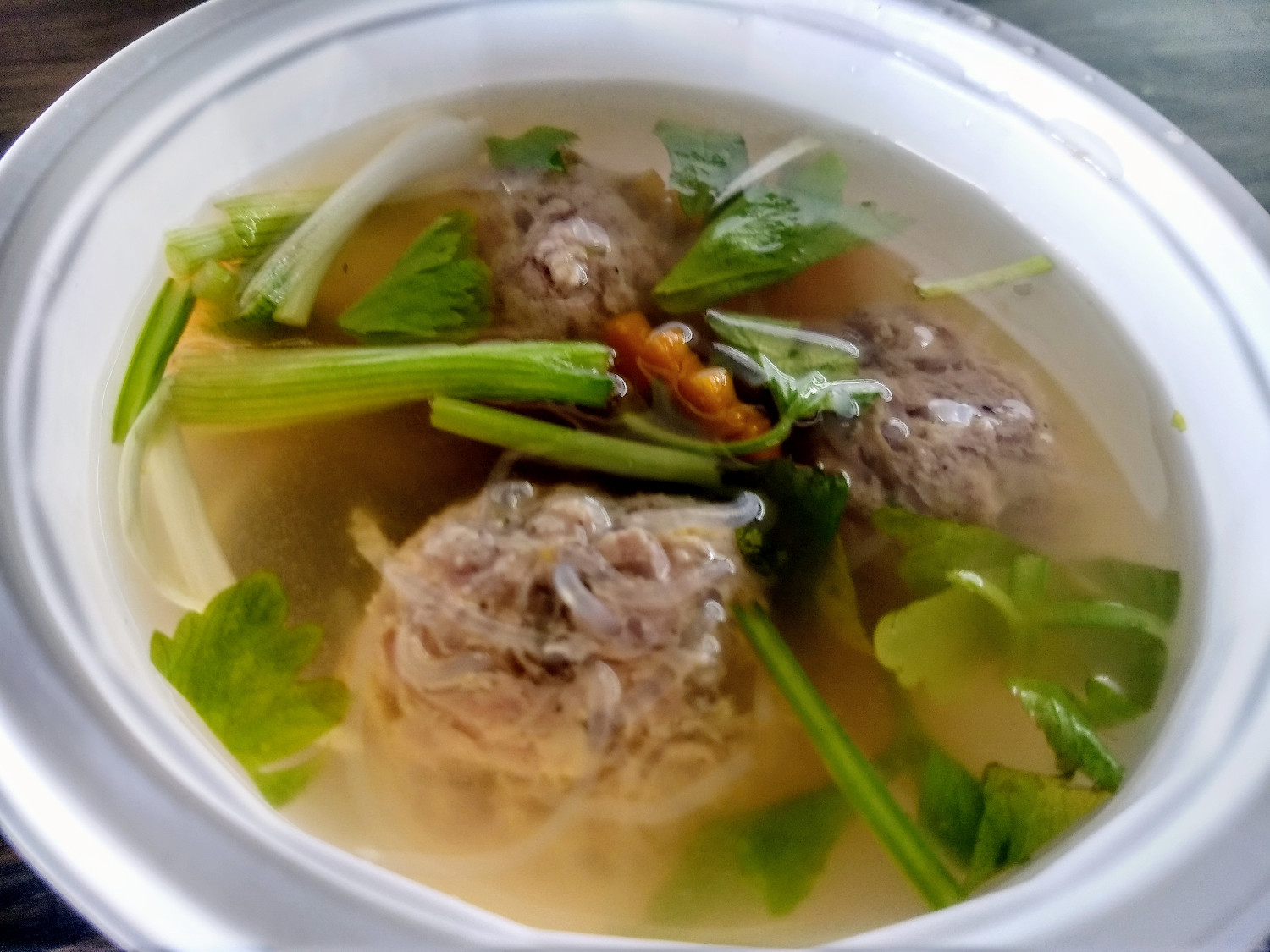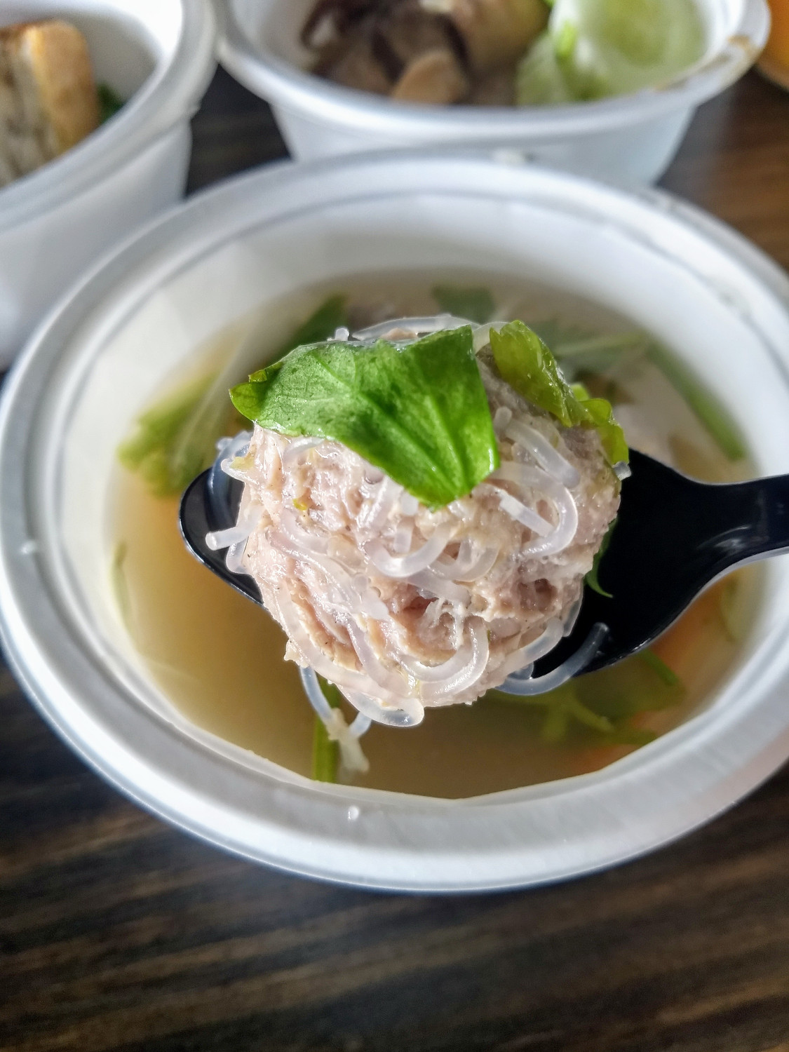 เดี๋ยวจะคอแห้ง หาอะไรน้ำมาซดให้คล่องคอสักหน่อย กับเมนู แกงจืดลูกเงาะ ชามละ 70 บาท ใส่ลูกเงาะมา 3 ลูกถ้วนๆ (ลูกเงาะก็คือหมูสับปรุงรสที่เอาปั้นเป็นก้อนๆหรือยัดไส้อาหาร) ใส่ผักมาให้ประปราย น้ำซุปสีใสๆ แต่ลูกเงาะลูกใหญ่พอสมควร คนปากใหญ่ถือว่ากินได้พอดีคำมากๆ