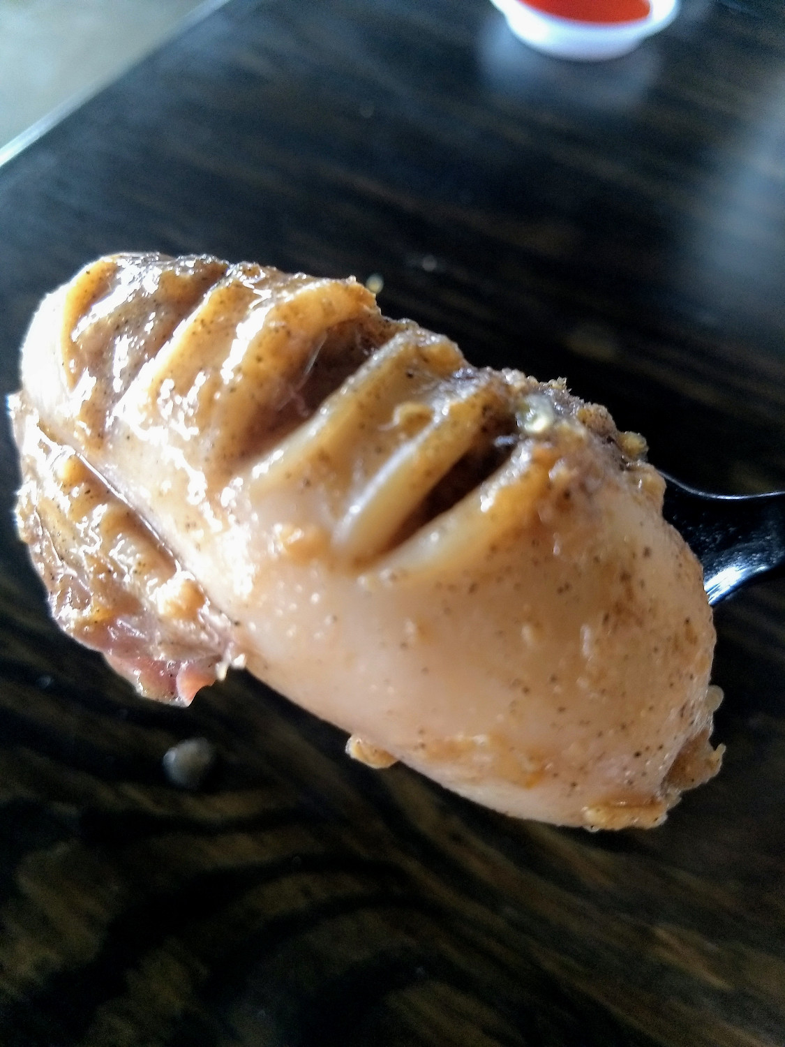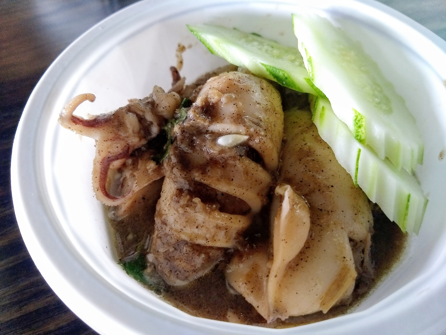 ลองชิมดูแล้วรสชาติถือว่าผ่าน น้ำผัดกระเทียมรสนัวๆเข้ากันดี ไม่มีเค็มหรือหวานโดดออกมา ได้รสและกลิ่นพริกไทยเต็มๆแต่ไม่ค่อยเผ็ดร้อน เด็กกินได้ผู้ใหญ่กินดี ตัวหมึกถึงแม้จะใหญ่ แต่เนื้อยังเด้งๆสดๆอยู่ ไม่เหนียวแต่เคี้ยวง่าย ส่วนไส้ของหมึกกินแล้วรู้สึกได้เลยว่า เป็นลูกเงาะที่กินก่อนหน้านี้เอามายัดไส้ โดยรวมถือว่าอรอ่ยมาก โอเคมาก เสียดายถ้ากินตอนร้อนๆน่าจะเวิร์คกว่านี้ จานเอาไปเลย 4.5/5