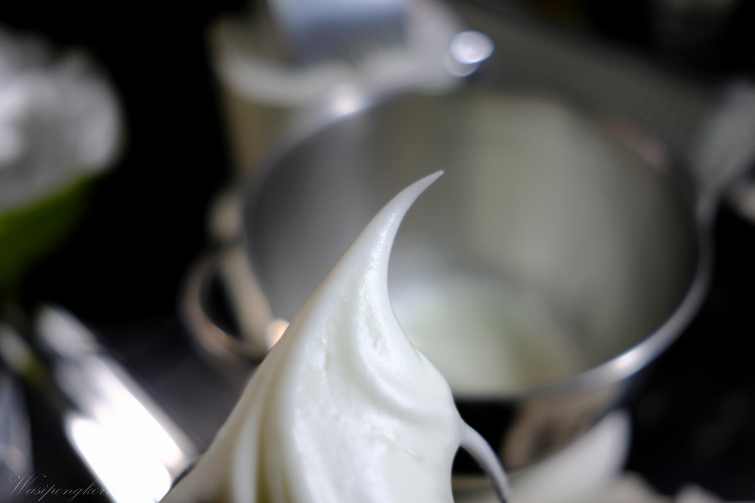 4. ตีเมอแรงค์วิธีการนี้จะให้มีพวกไข่แดงปนไปไม่ได้มิเช่นนั้นอาจจะตีไม่ขึ้น แต่ถ้าติดไข่แดงนิดหน่อยสำหรับบางคนอาจจะลำบากให้การตักไข่แดงออก