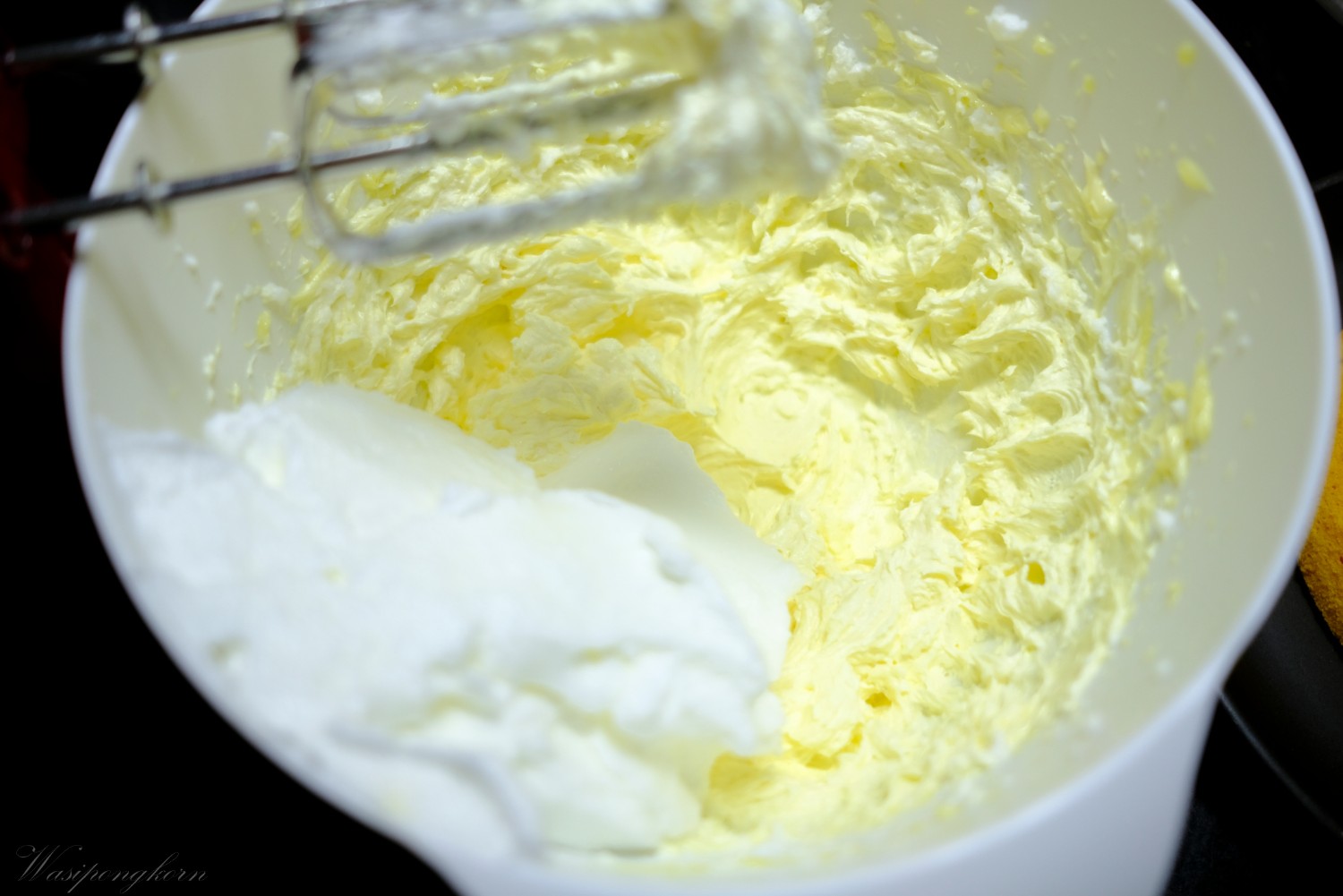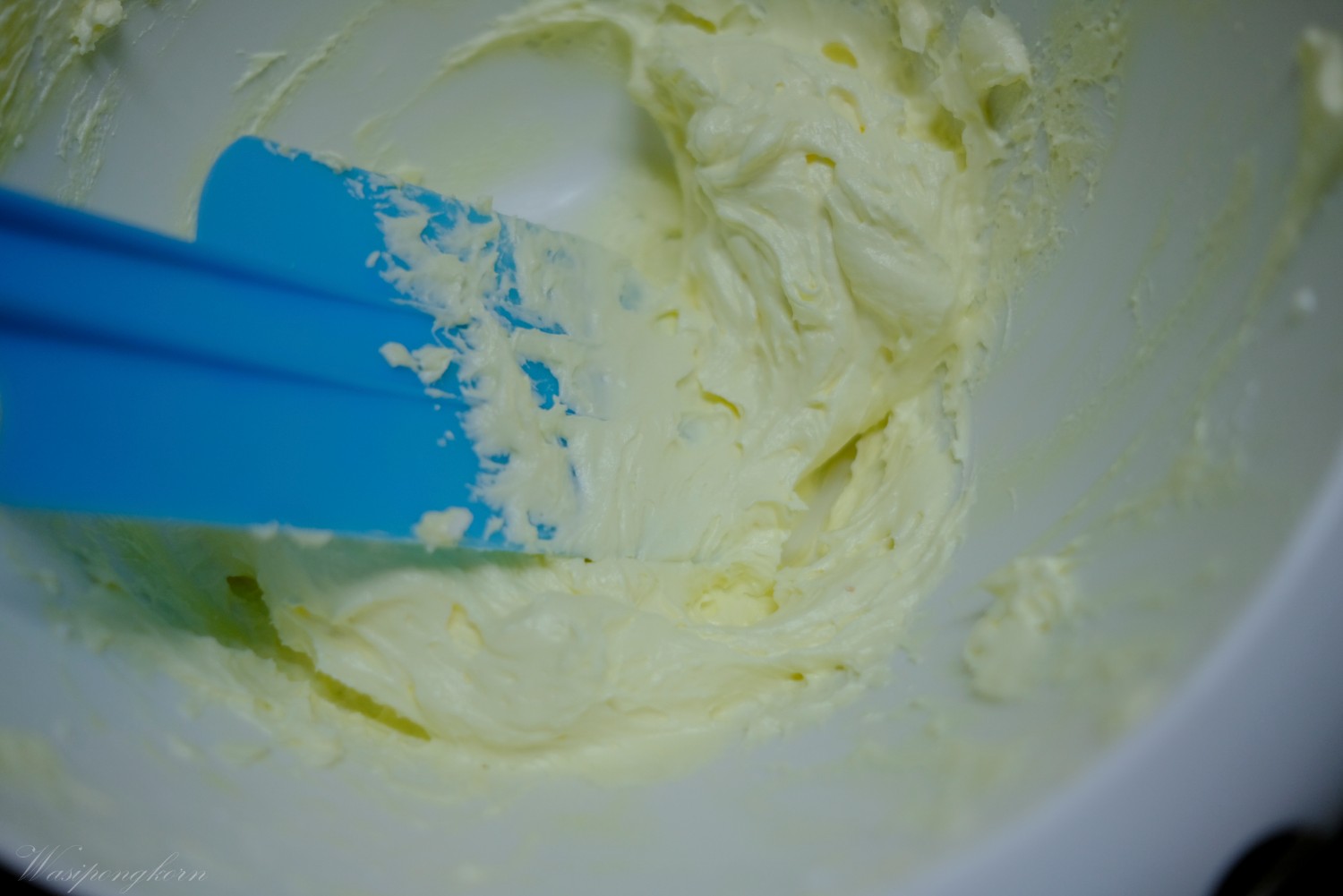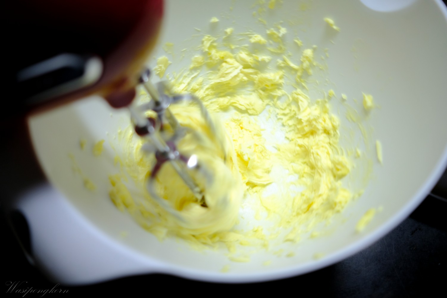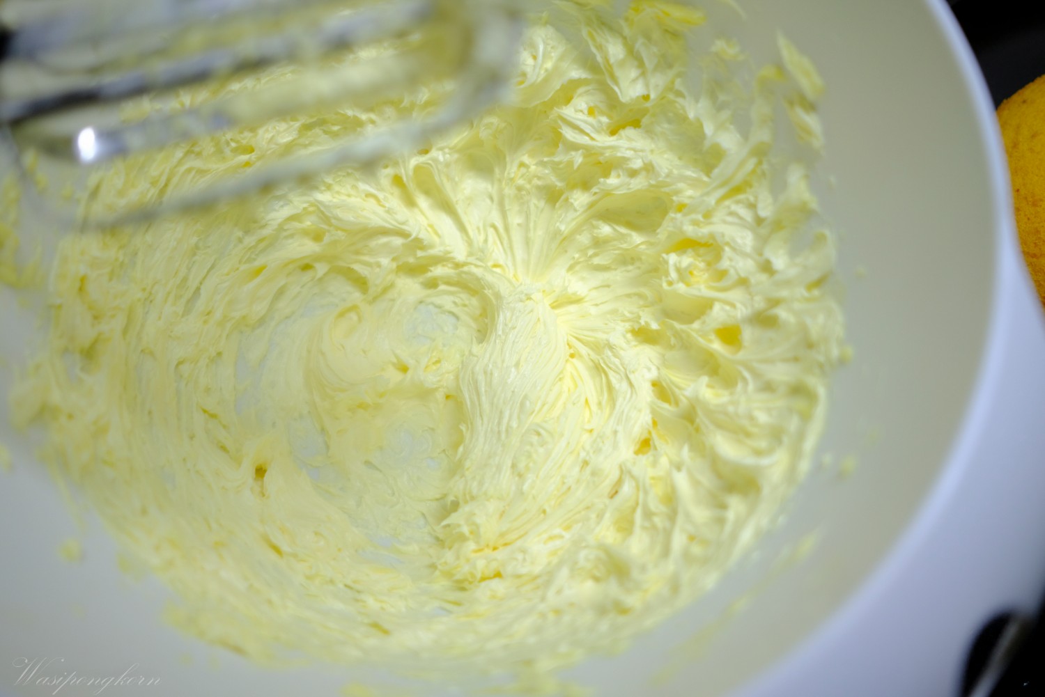 1. เตรียมเนยสดไว้อุรหภูมิห้องตีตนจากสีเหลืองๆ กลายเป็นสีขาว