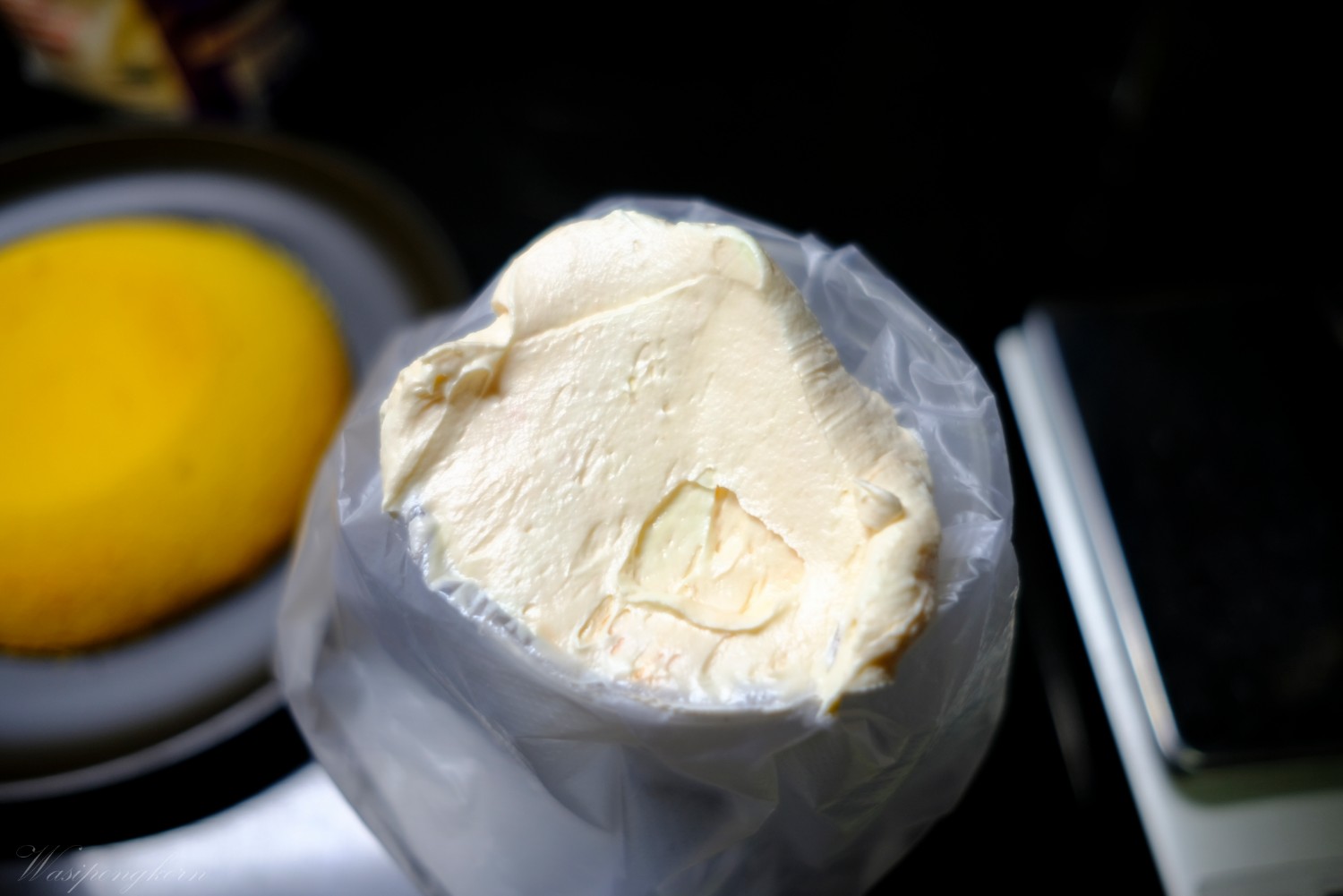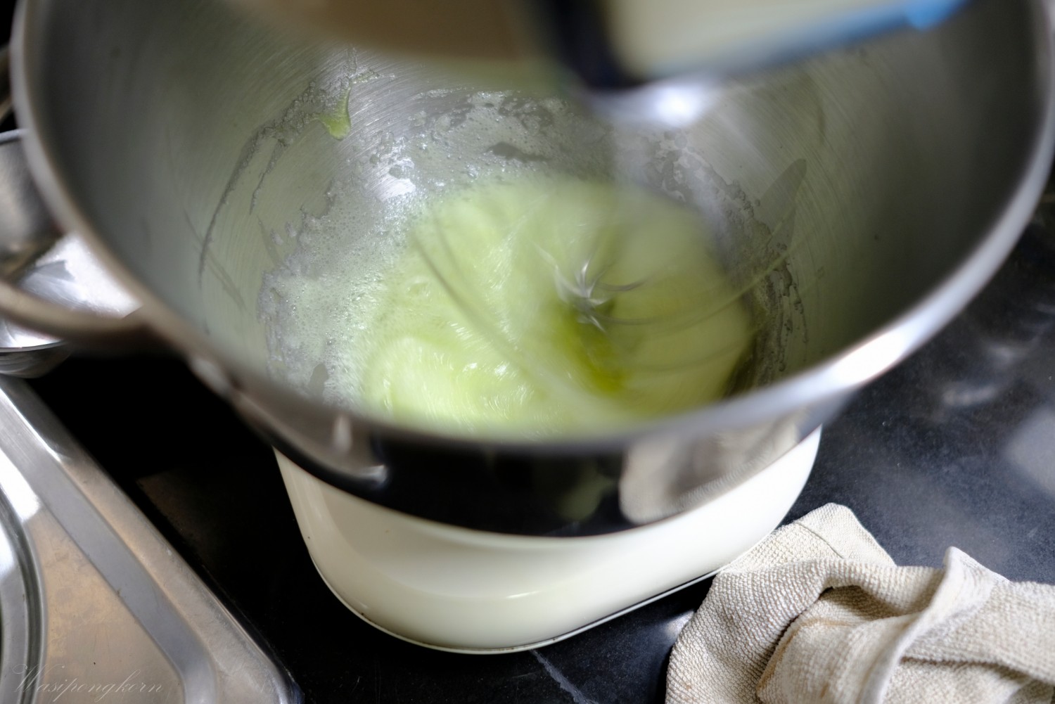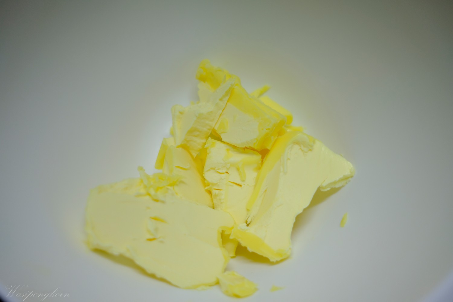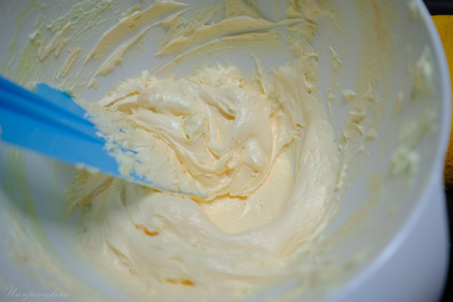 1. เตรียมเนยสดไว้อุรหภูมิห้องตีตนจากสีเหลืองๆ กลายเป็นสีขาว
