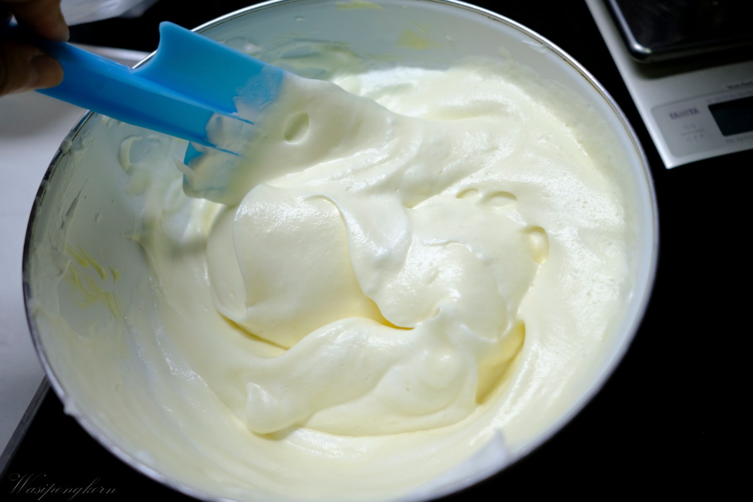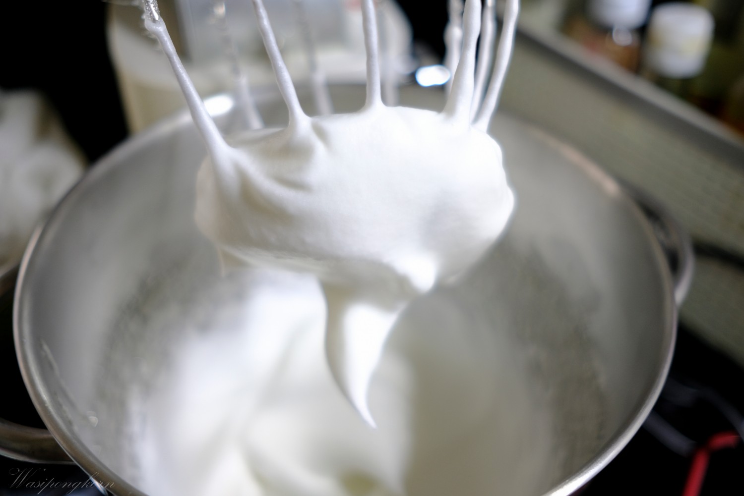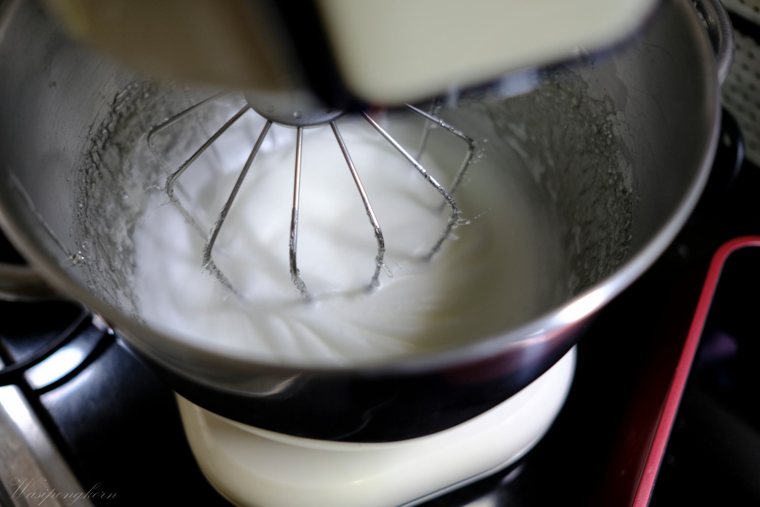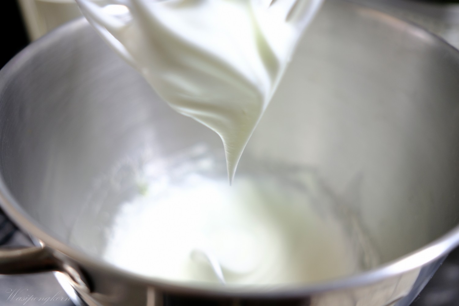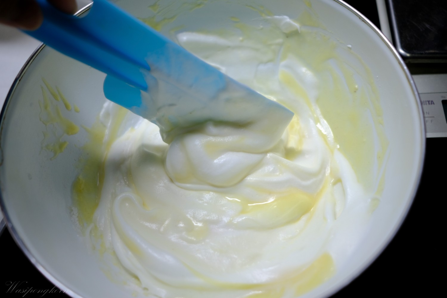 3. ค่อยๆ เทน้ำตาลลงไปที่ไข่ขาวและตีไปเรื่อยๆ เทน้ำตาลจนหมด ตีให้ขึ้นฟู