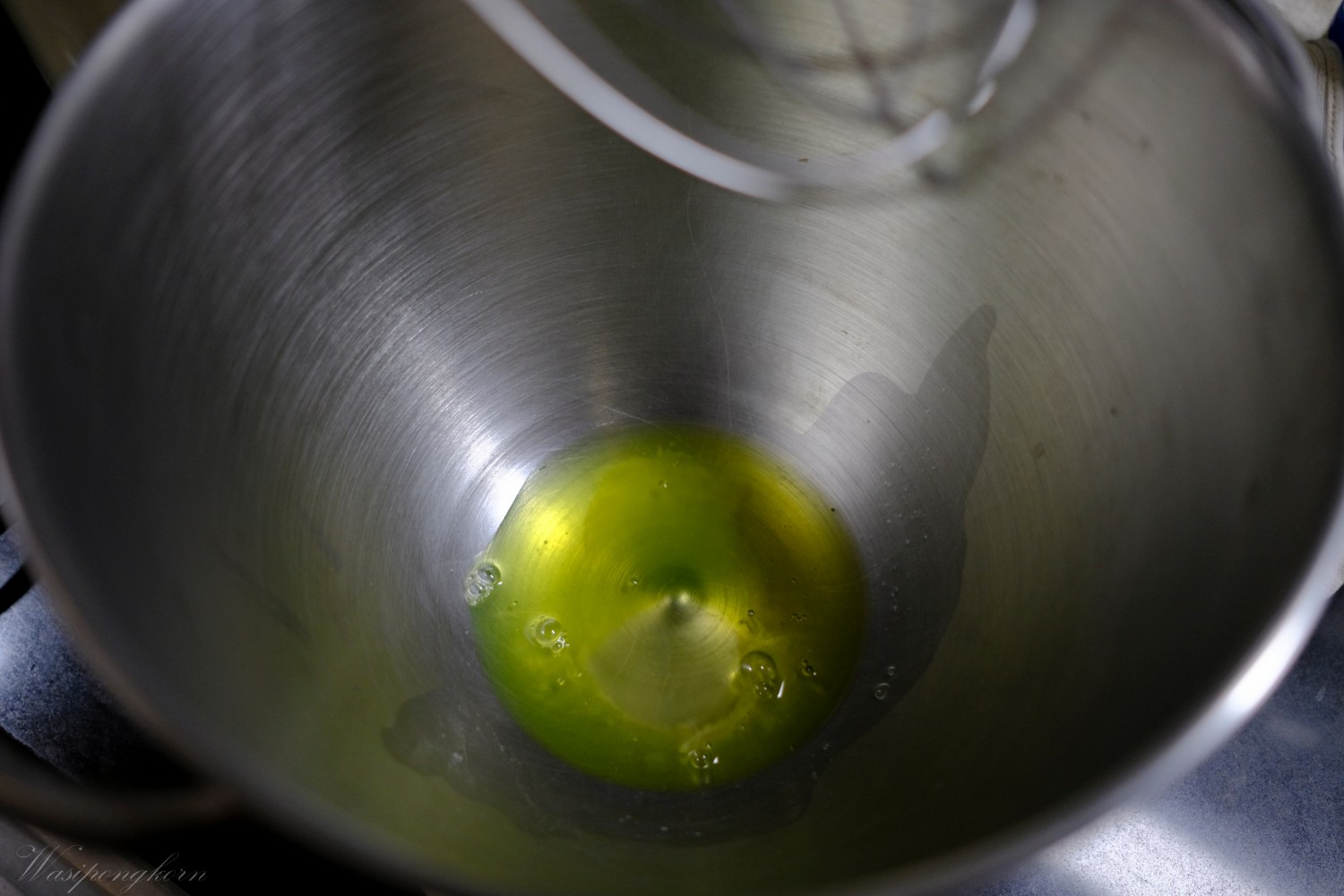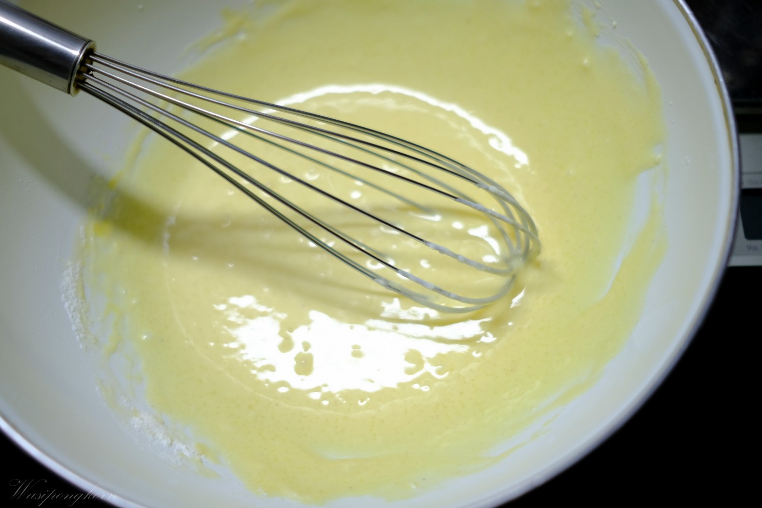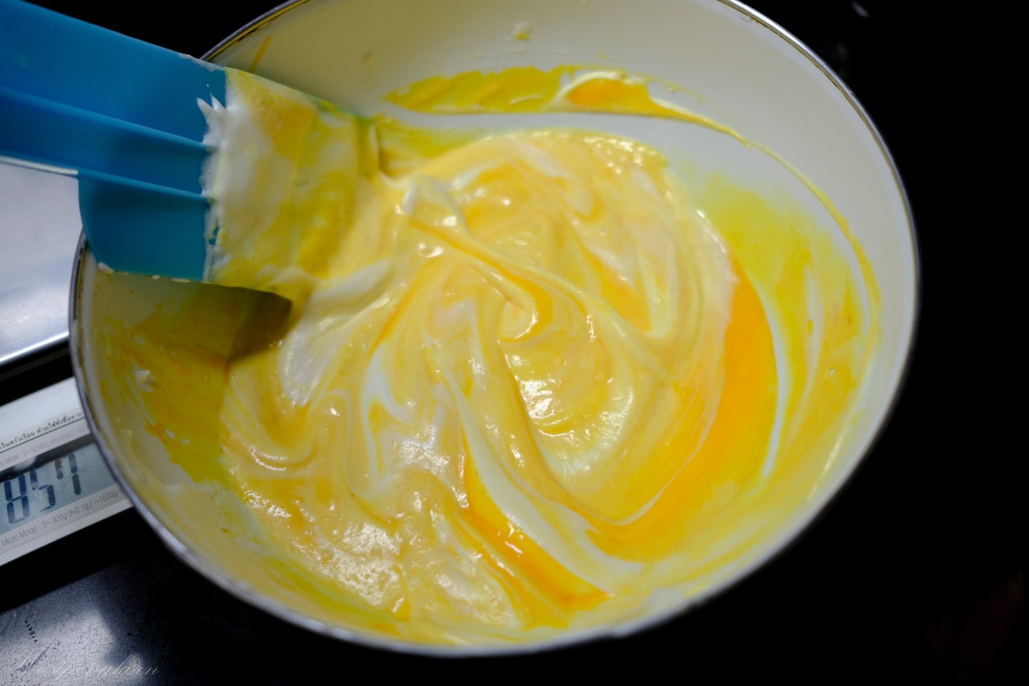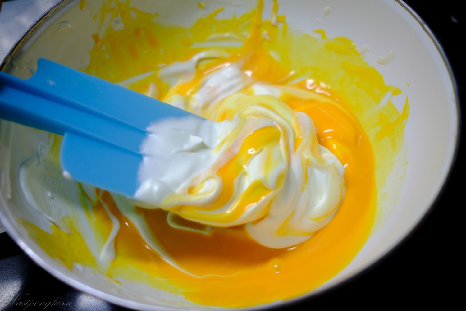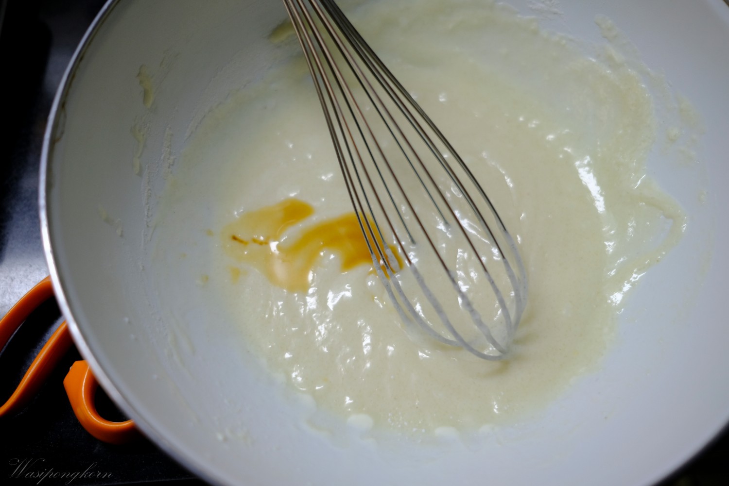5. ผสมแป้งเข้ากันส่วนผสมไข่แดง น้ำมัน นม ผสมให้เข้ากัน