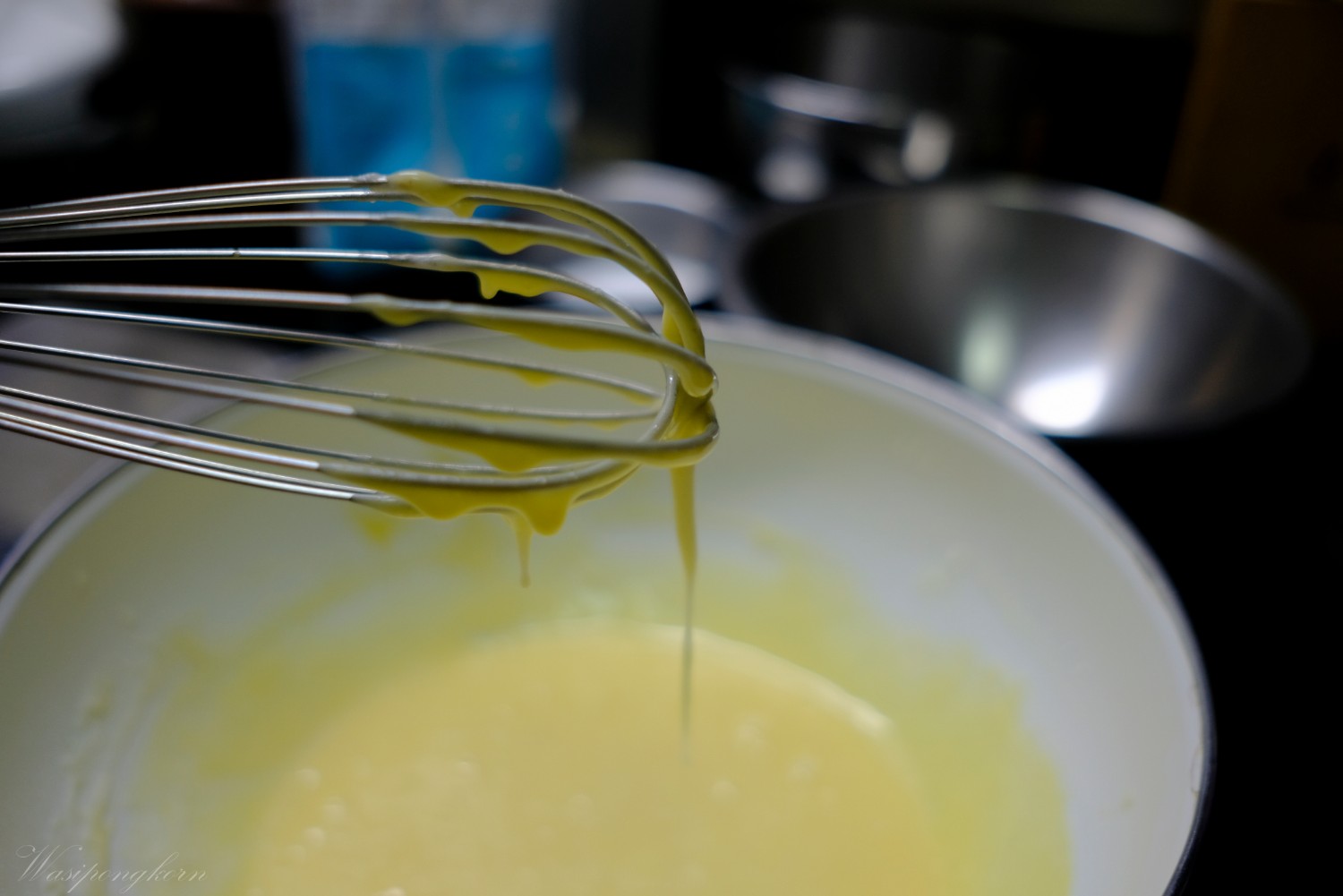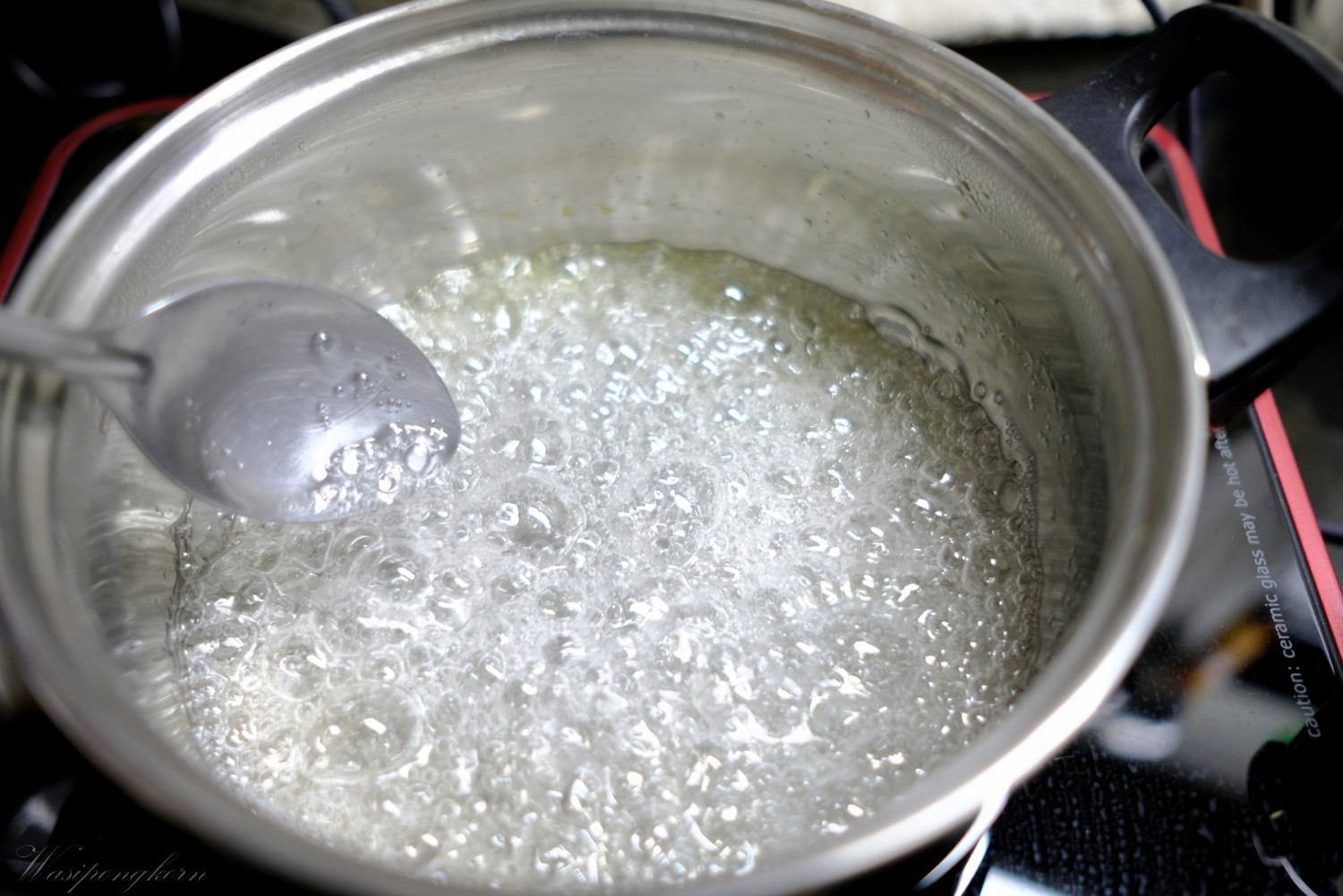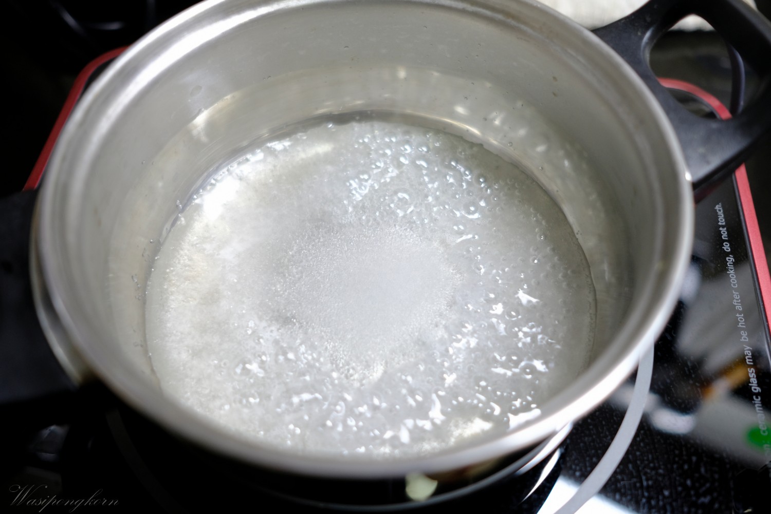 2. ต้มน้ำตาลกับน้ำให้อยู่ที่ 108 บวกลบนิดๆ หน่อย ก็ไม่เป็นไร หรือถ้าไม่มีตัววัดก็เอาดุว่าก่อนจะกลายเป็นขั้นตอน คาราเมลคือเหลืองๆ ไหม้ๆ ฟองของน้ำตาลจะใหญ่ๆ ปุดๆ ช้าๆก็ใช้ได้แล้ว ระหว่างต้มอยู่ก็ตีไข่ขาวให้ขึ้นฟองนิดๆเดียว