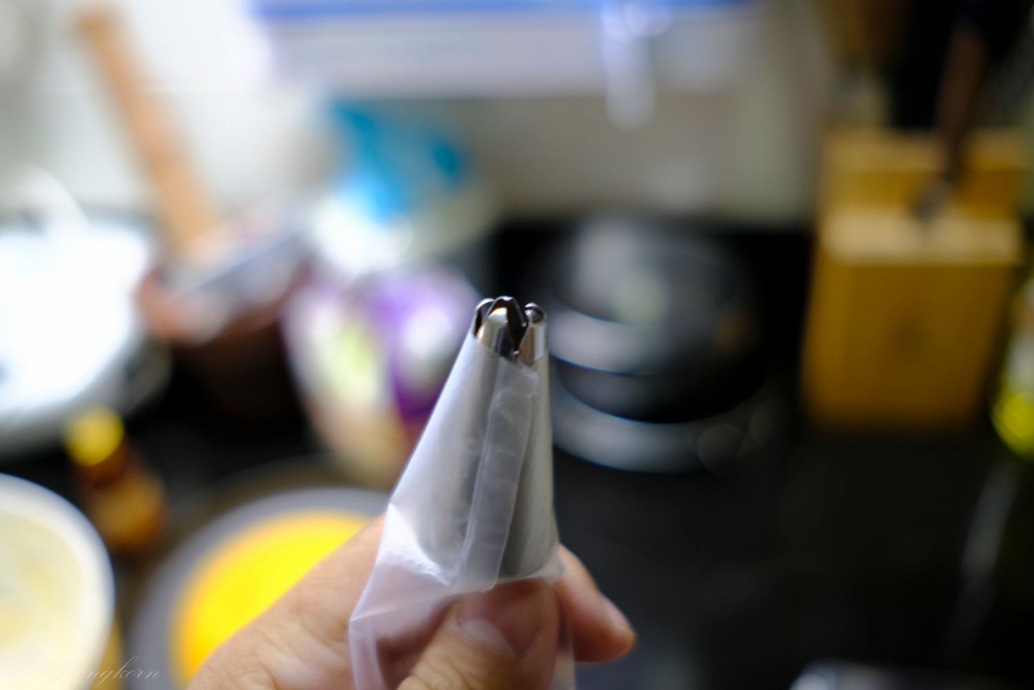 5. เตรียมใส่หัวบีบชอบแบบไหน ทรงไหนอะไรอย่างสุดแล้วแต่ความชอบ ผมผสมสีส้มนิ๊ดๆ แล้วก็ค่อยๆ บีบลงบนเค้กส่วนใครจะผ่าตรงกลางทาด้านใน ใส่อะไรลงไปก็ได้เช่นกัน แต่วันนี้เนื้อเค้กบางแล้วไม่ต้องผ่ากลาง