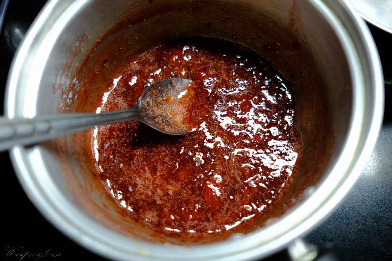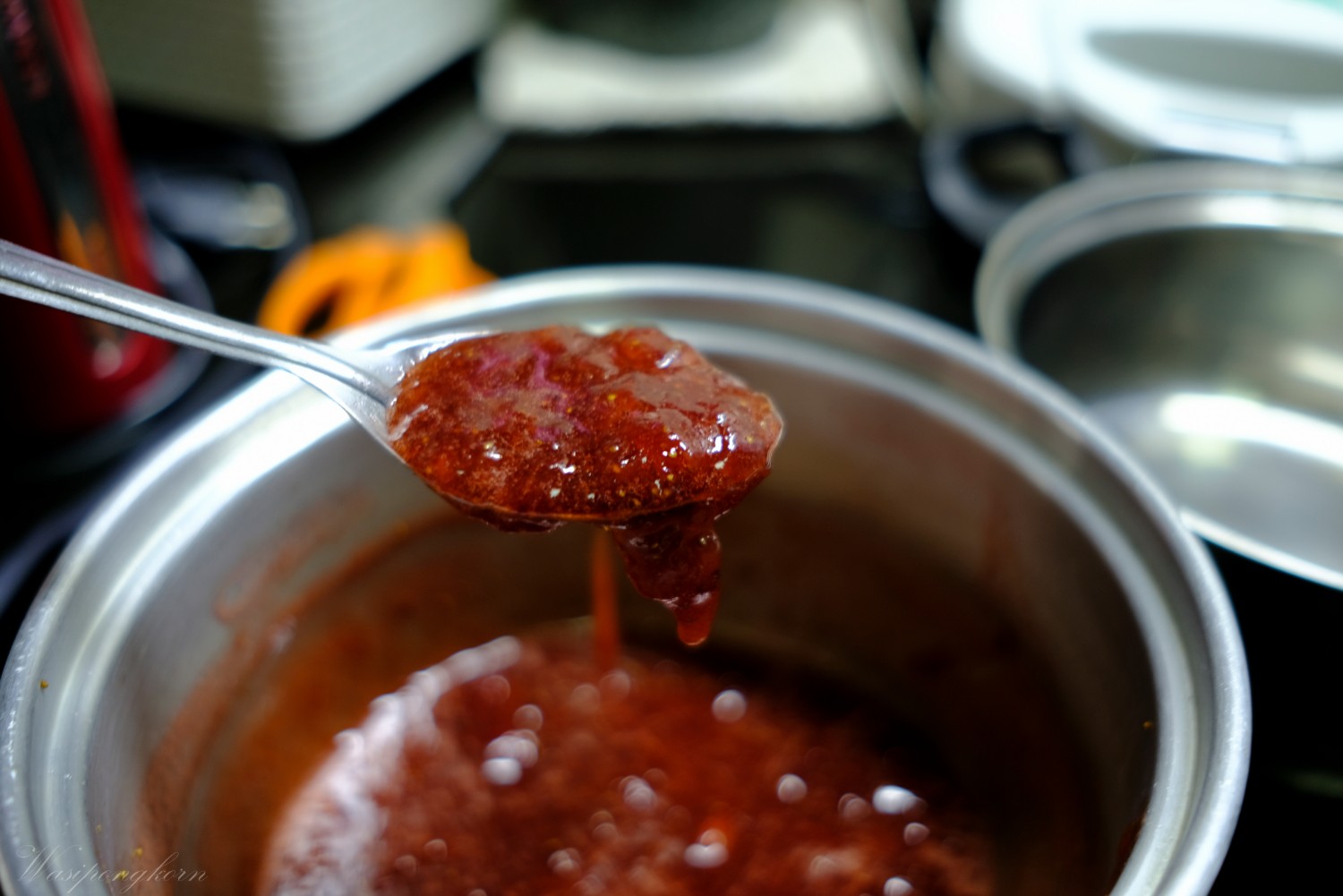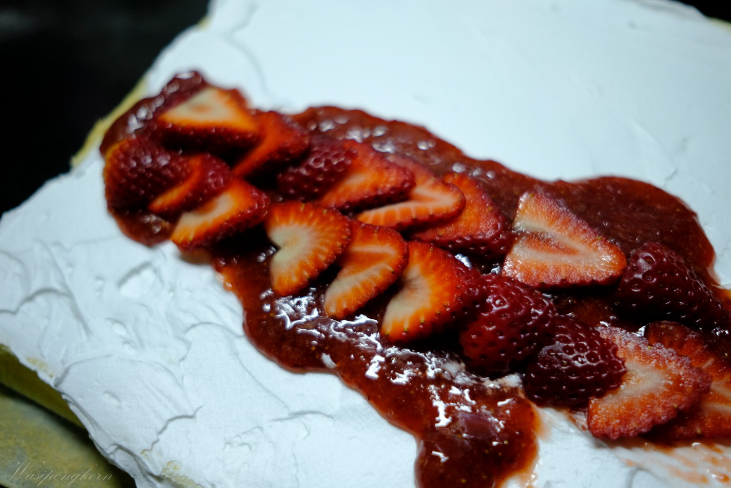1. แยมจะหาซื้อแบบสำเร็จหรือถ้าอยากทำเองก็ได้ ต้มสตรอเบอรี่กับน้ำตาล แล้วกวนให้เข้ากัน ตัวสตรอเบอรี่จะเหนียวจับตัวกันพอดีไม่ต้องใส่แป้ง พักไว้ให้เย็นห้ามทาเป็นไส้ตอนร้อนเด็ดขาด