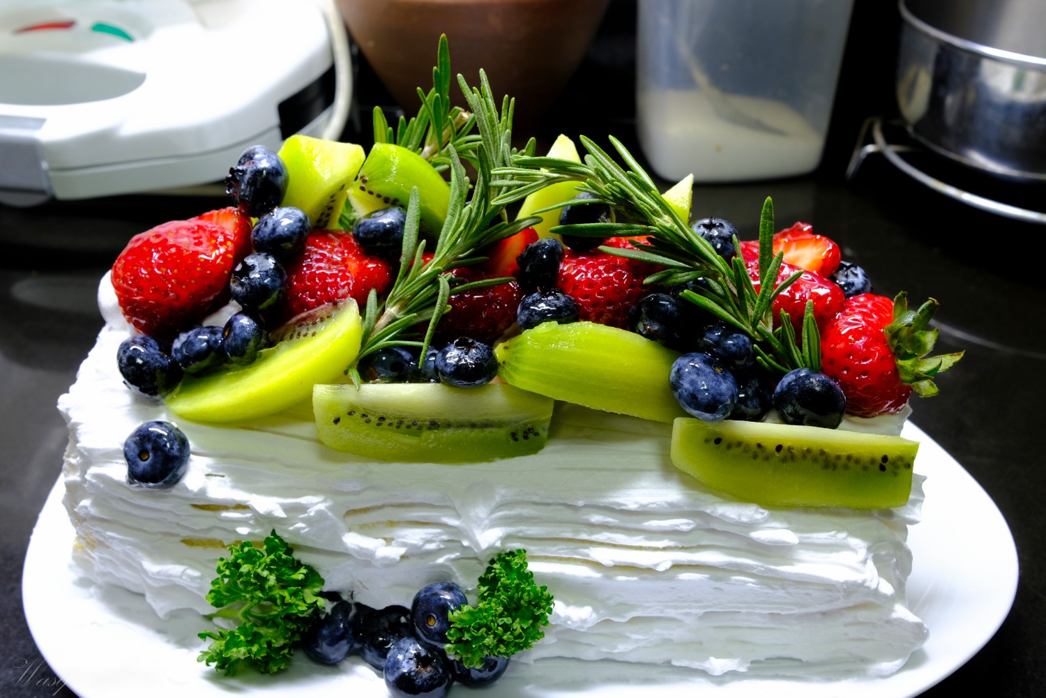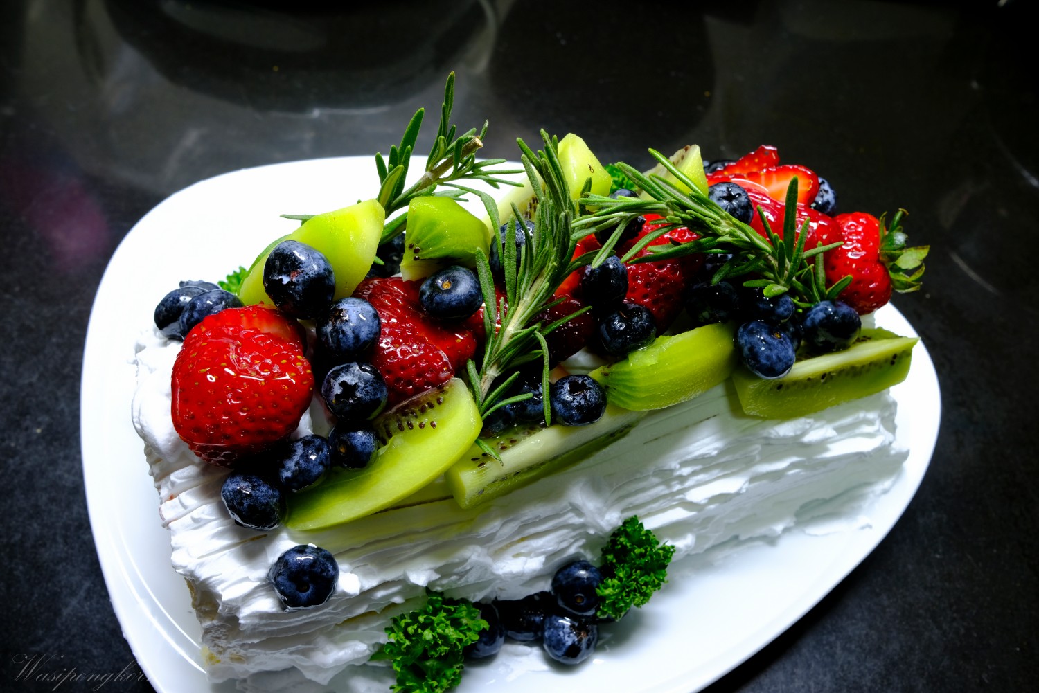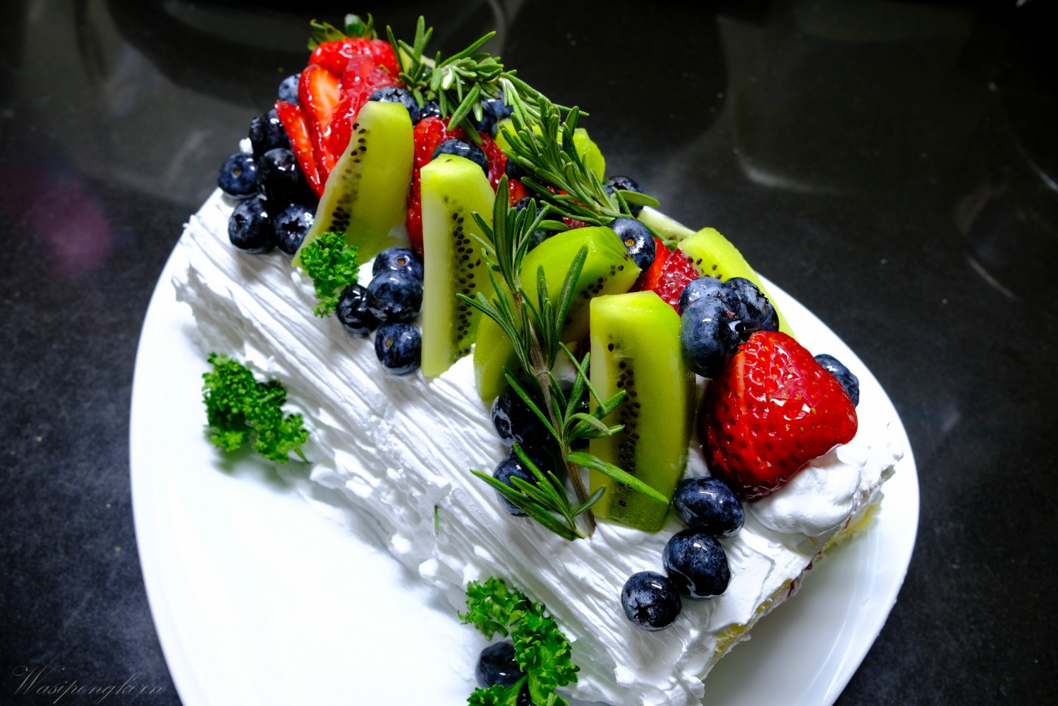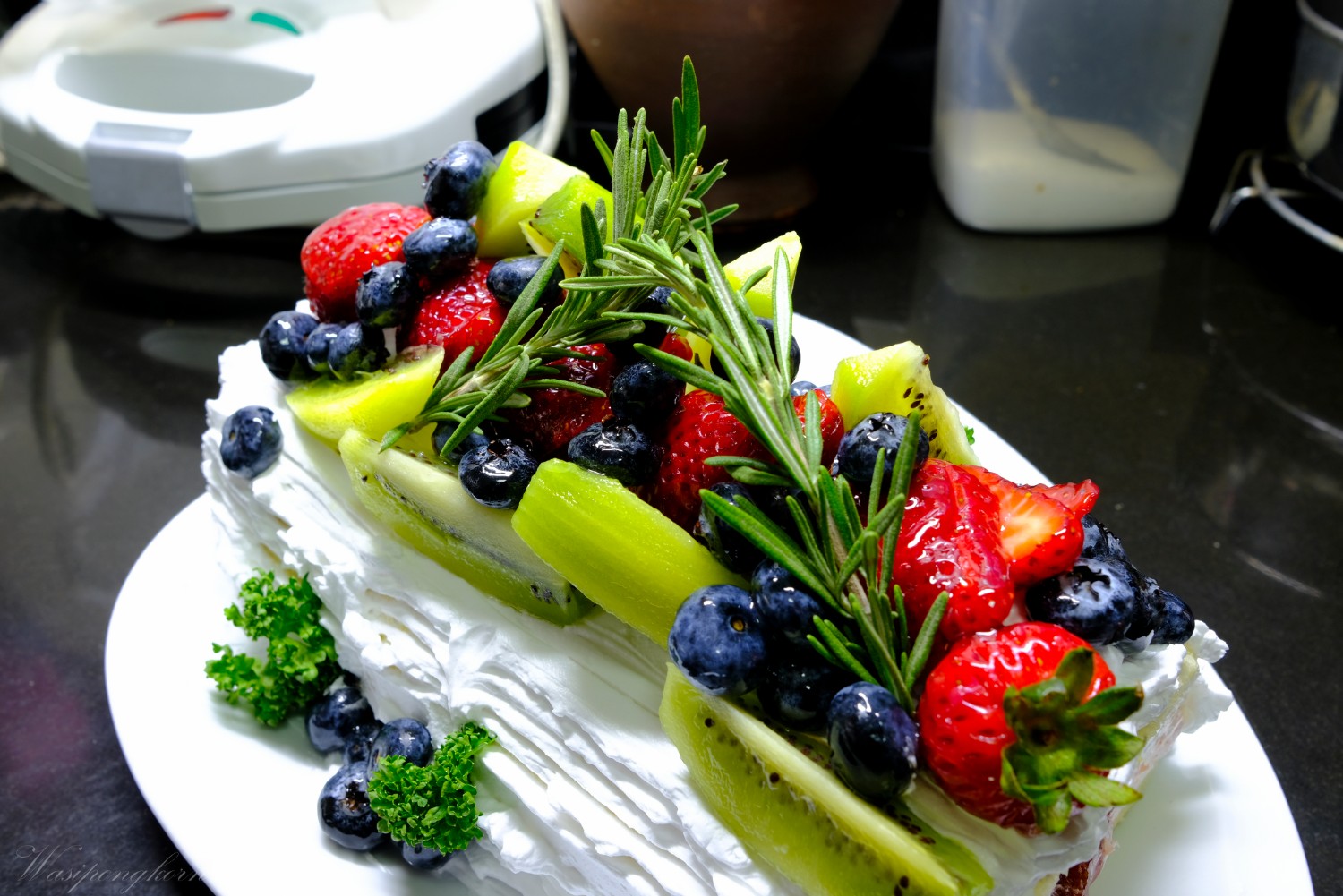 2. ตีวิปครีมเตรียมไว้ปาดเข้ากับเนื้อเค้ก และทาแยมลงไป พร้อมกับวางผลไม้ตามชอบ